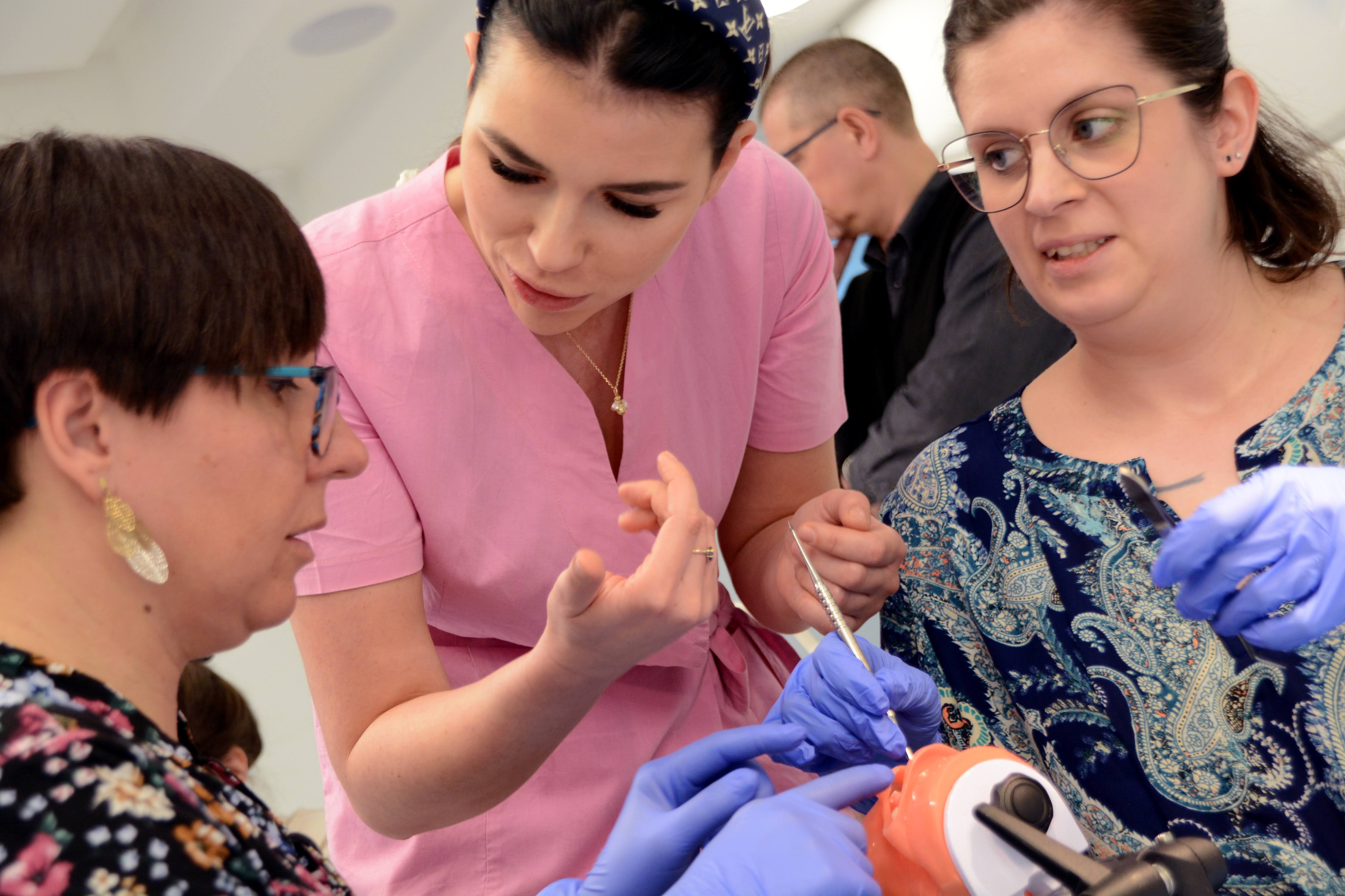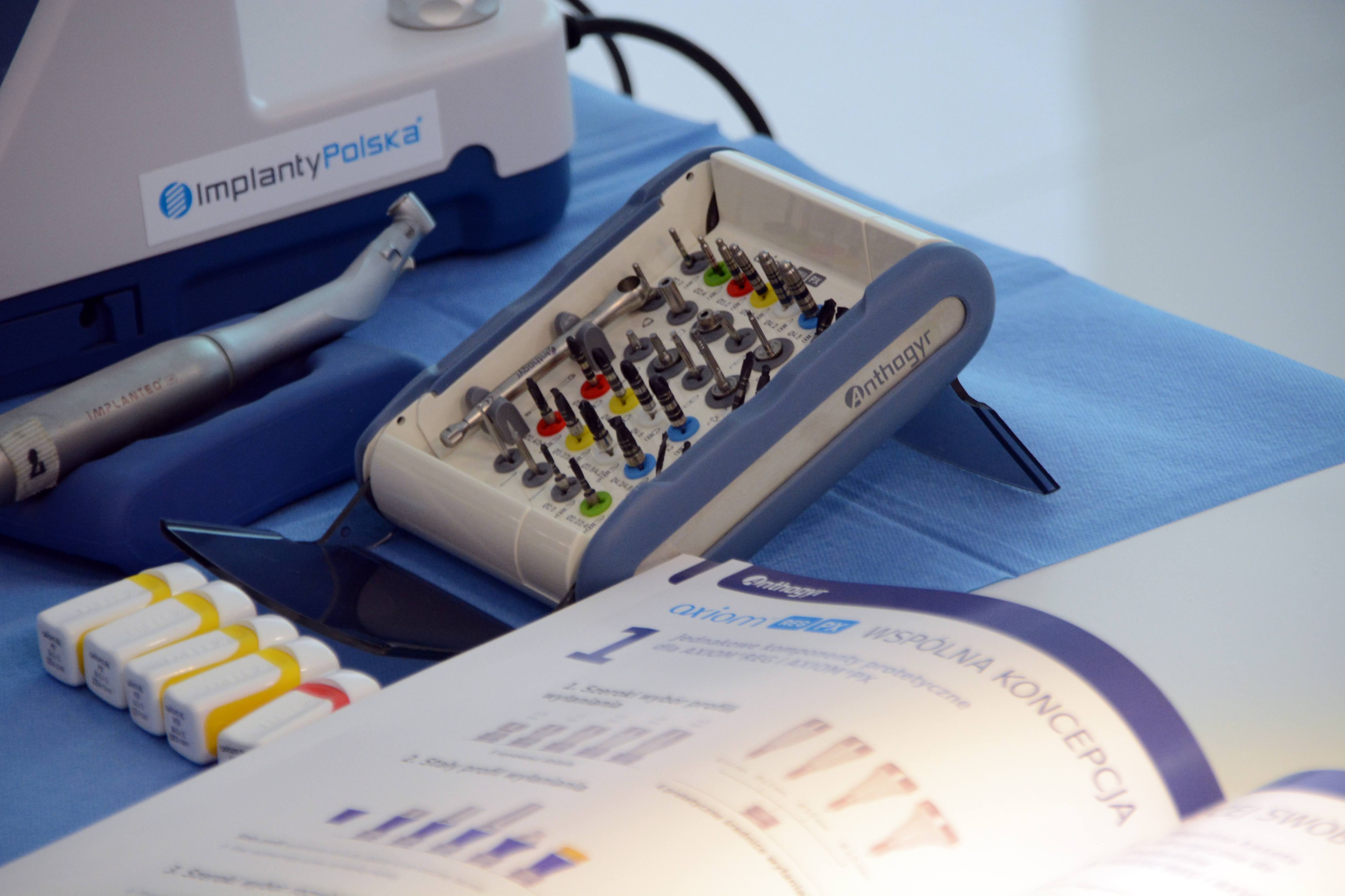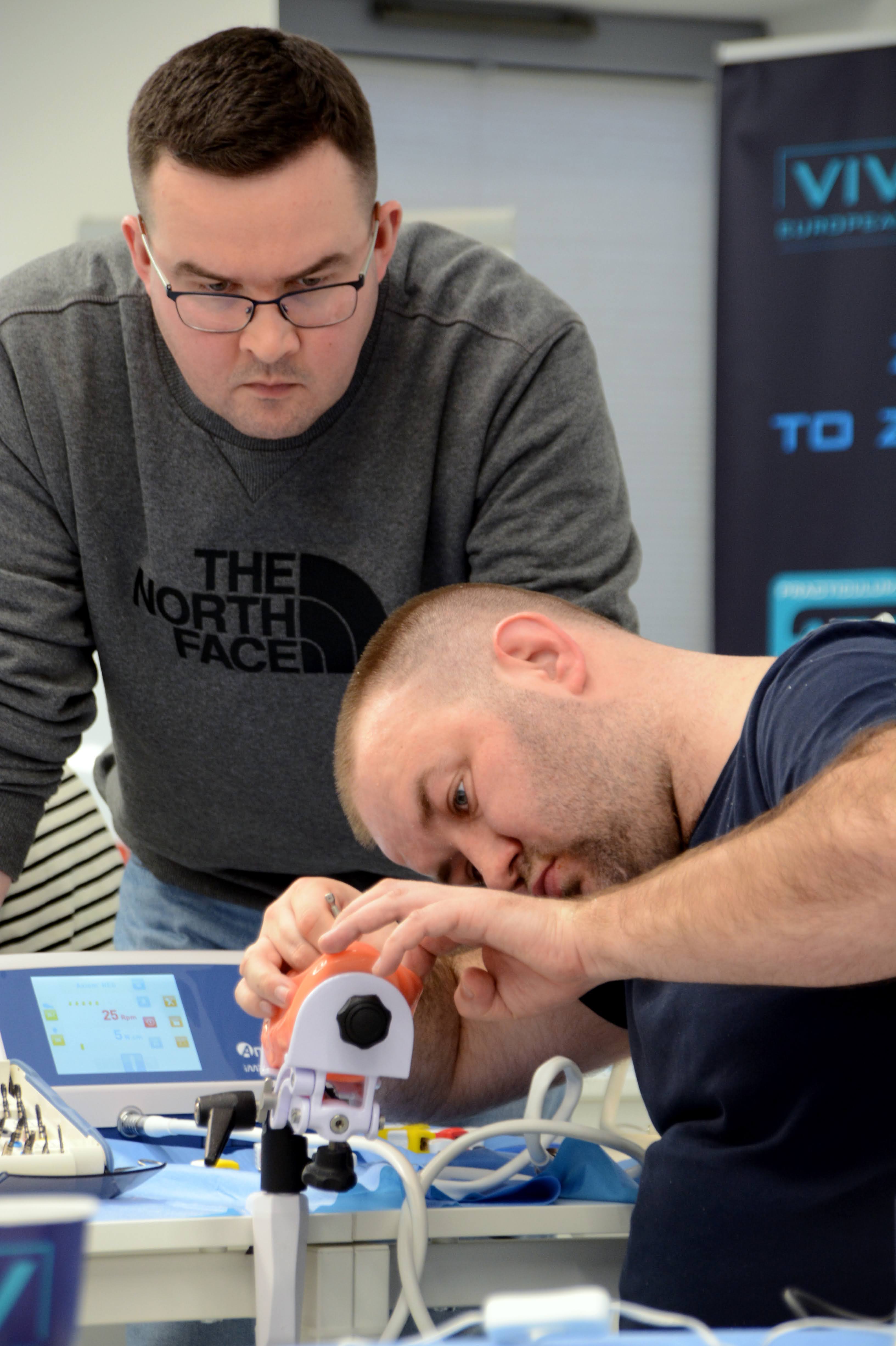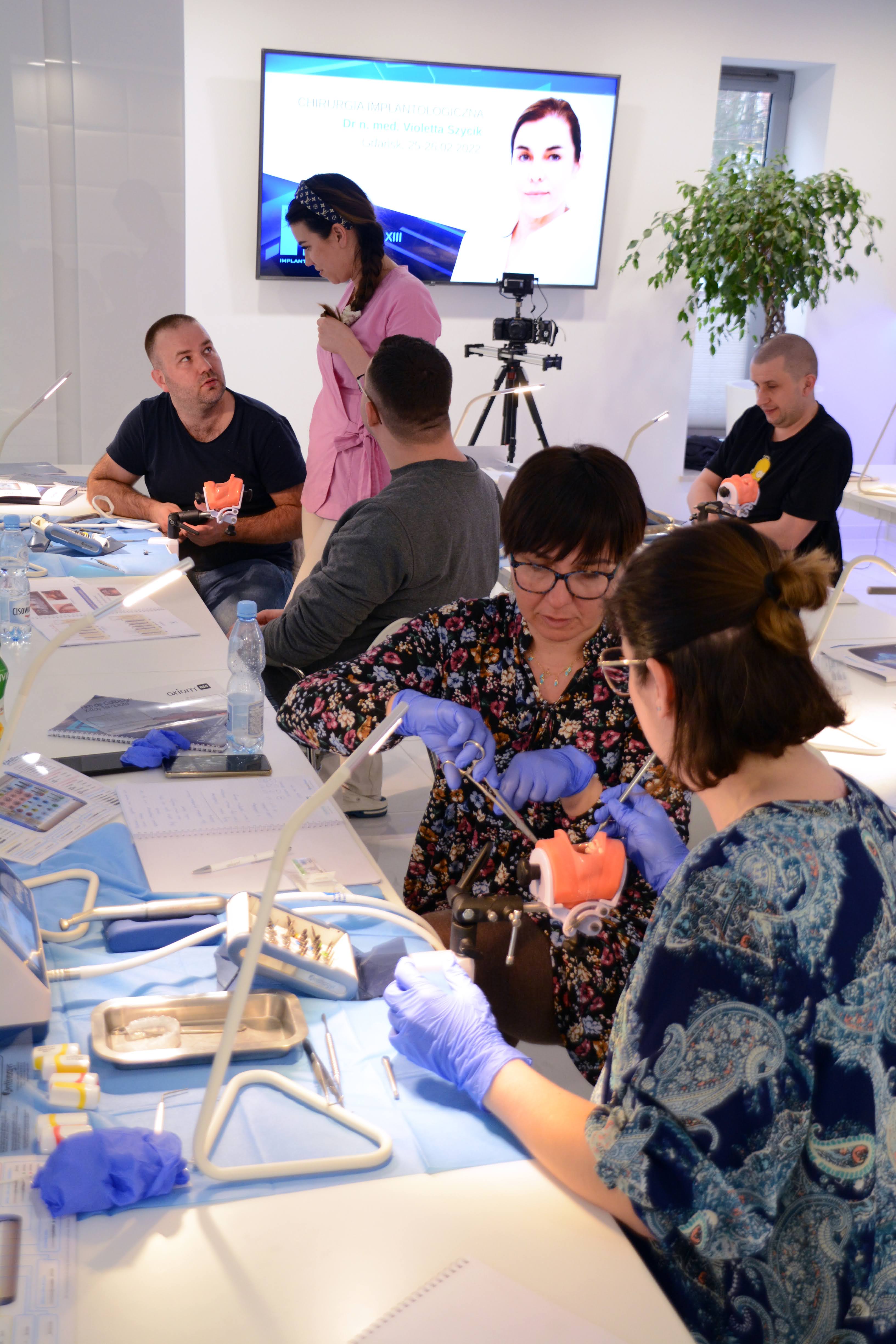 Drugi dzień zdominowała praktyka i intensywne ćwiczenia na sali warsztatowej z wprowadzania implantów - regularnych i agresywnych oraz technik szycia po implantacji, na modelach oraz zaawansowanych manekinach szkoleniowych. Poprzedziła je prezentacja systemu implantologicznego Axiom®, w którym prowadzone jest szkolenie.