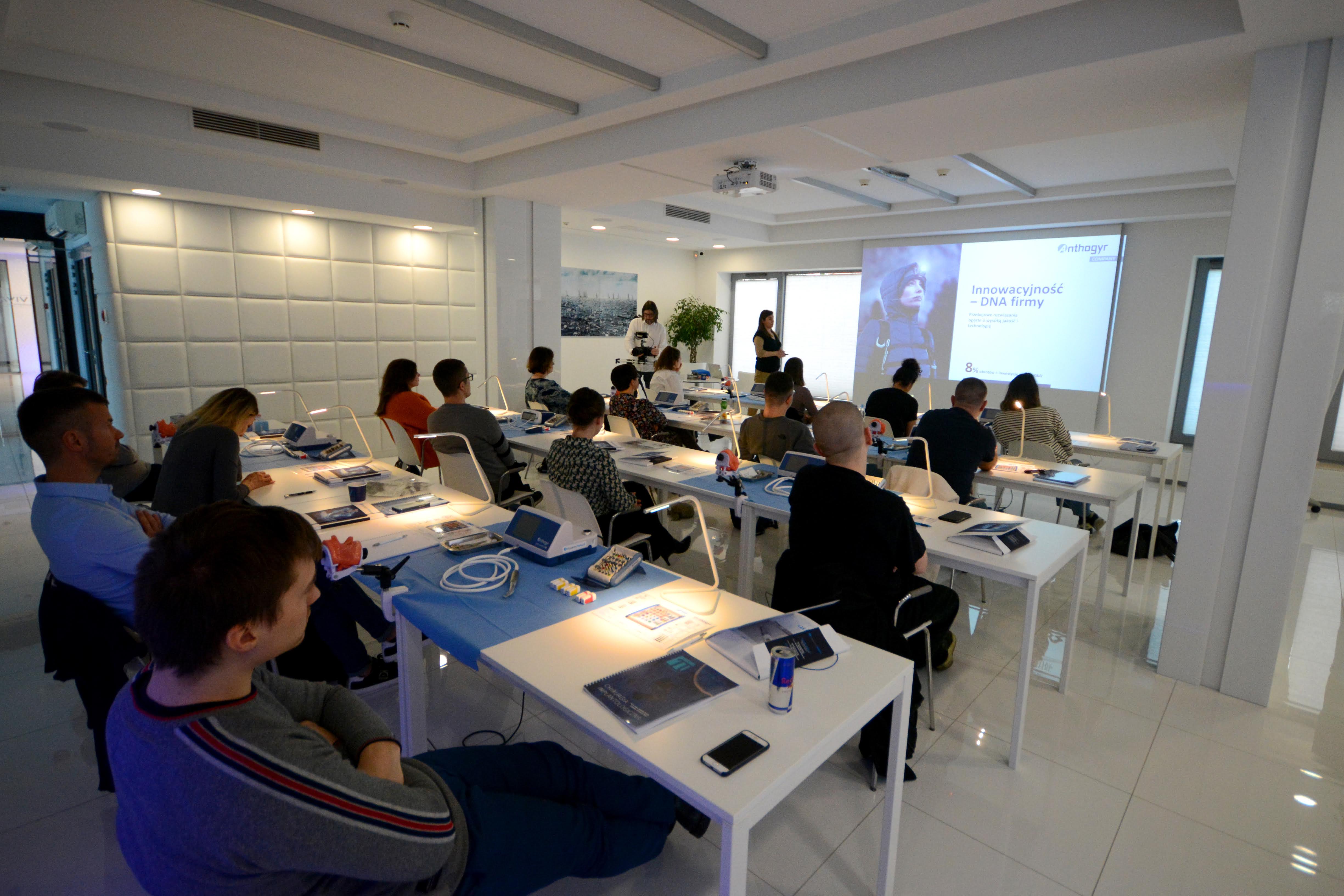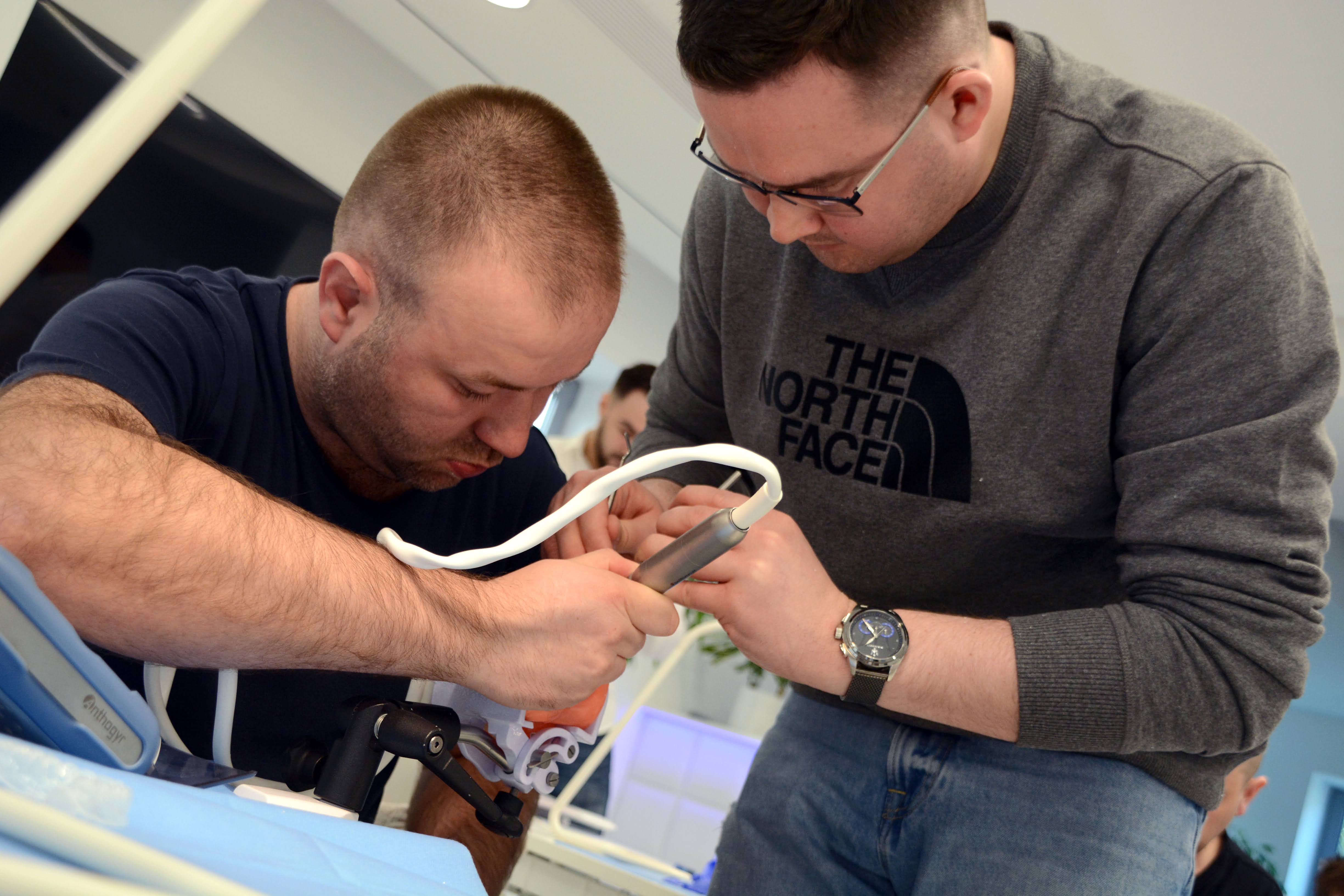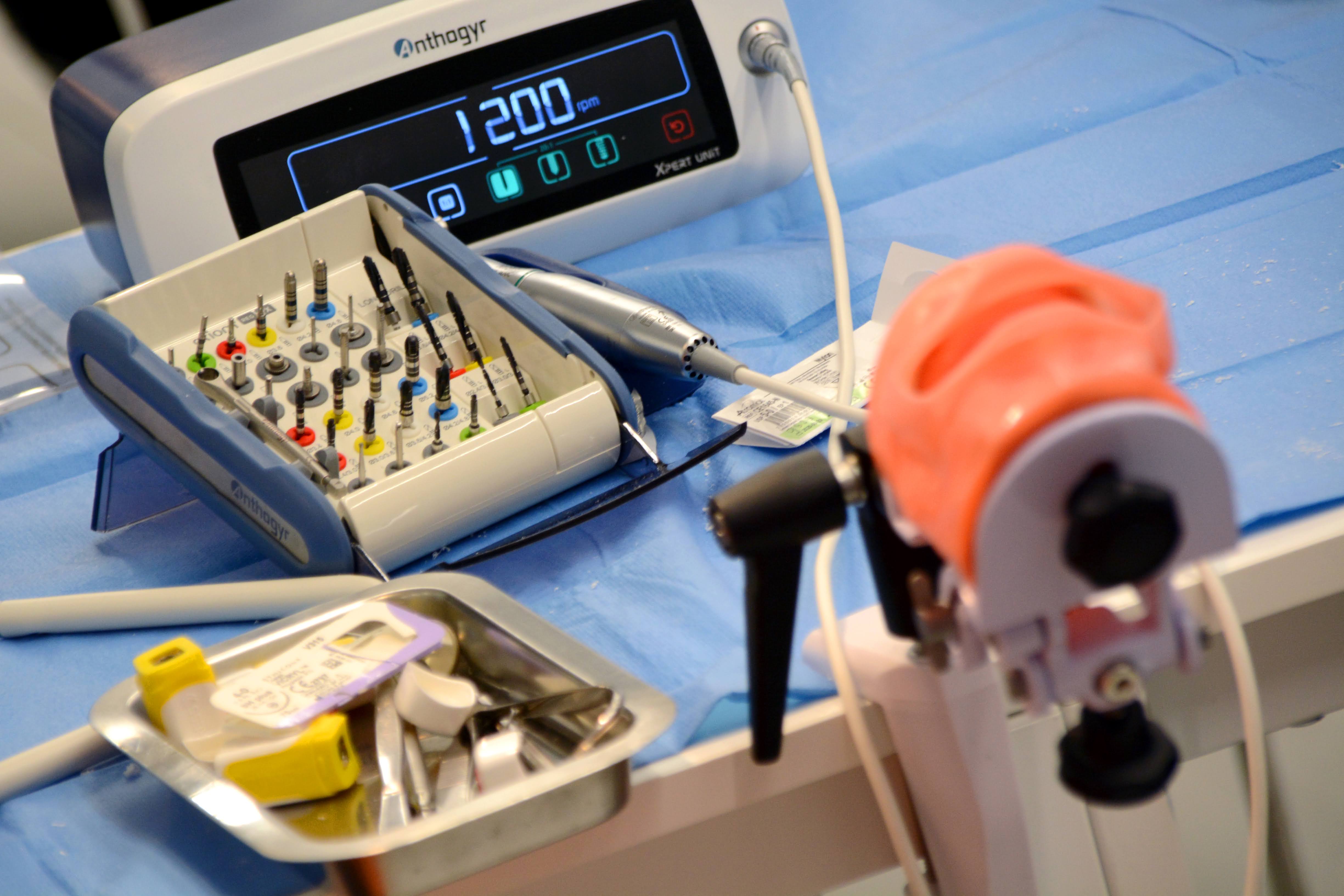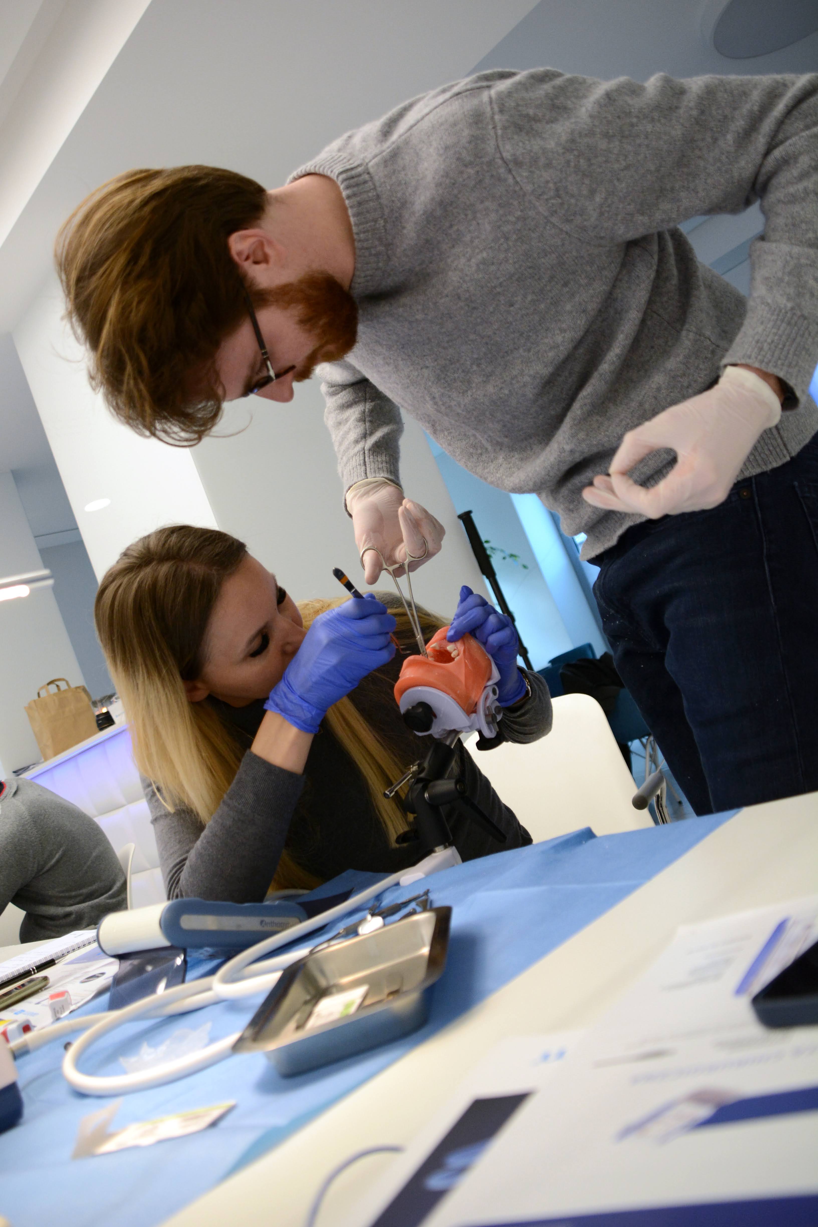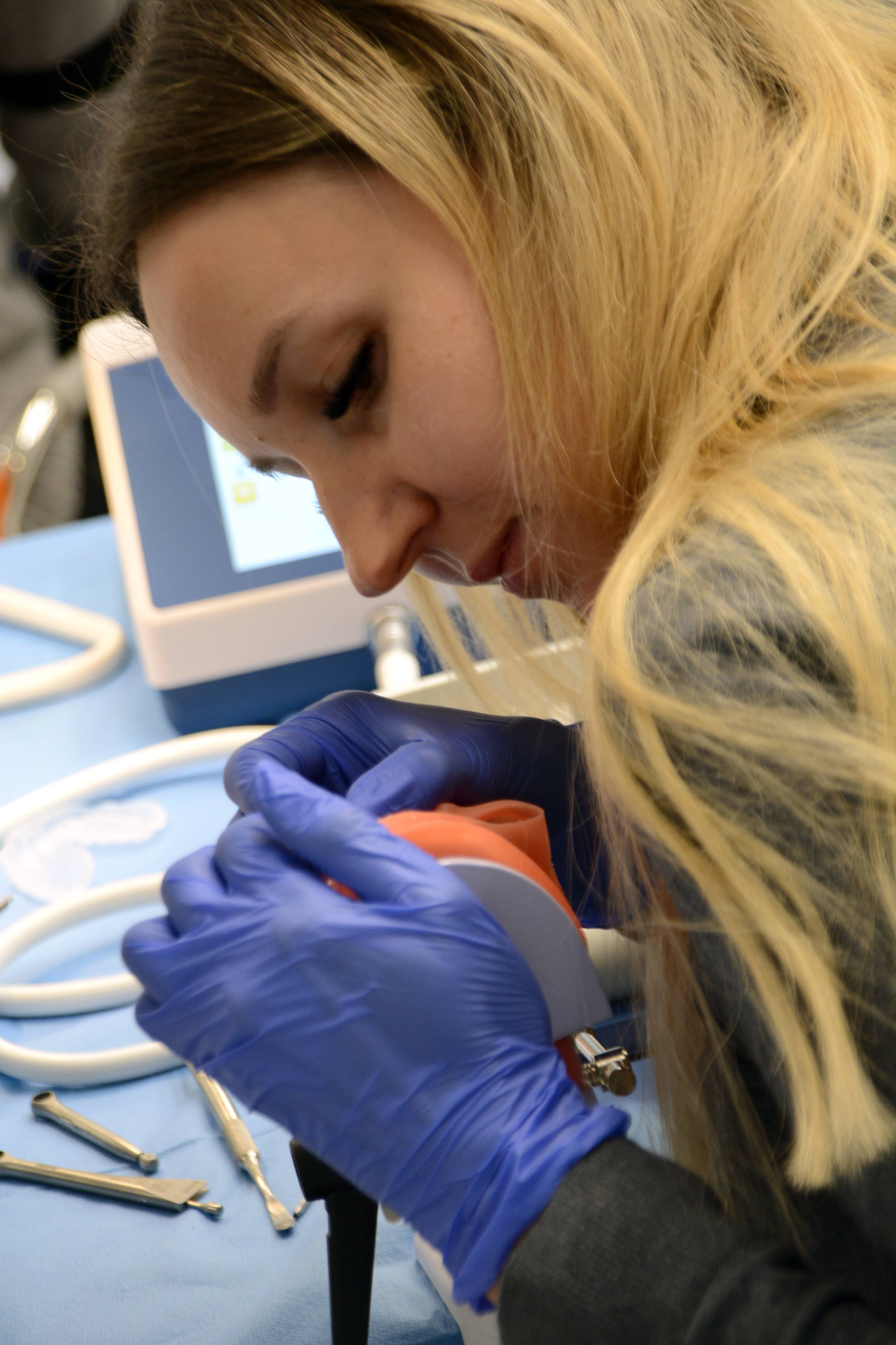 Drugi dzień zdominowała praktyka i intensywne ćwiczenia na sali warsztatowej z wprowadzania implantów - regularnych i agresywnych oraz technik szycia po implantacji, na modelach oraz zaawansowanych manekinach szkoleniowych. Poprzedziła je prezentacja systemu implantologicznego Axiom®, w którym prowadzone jest szkolenie.