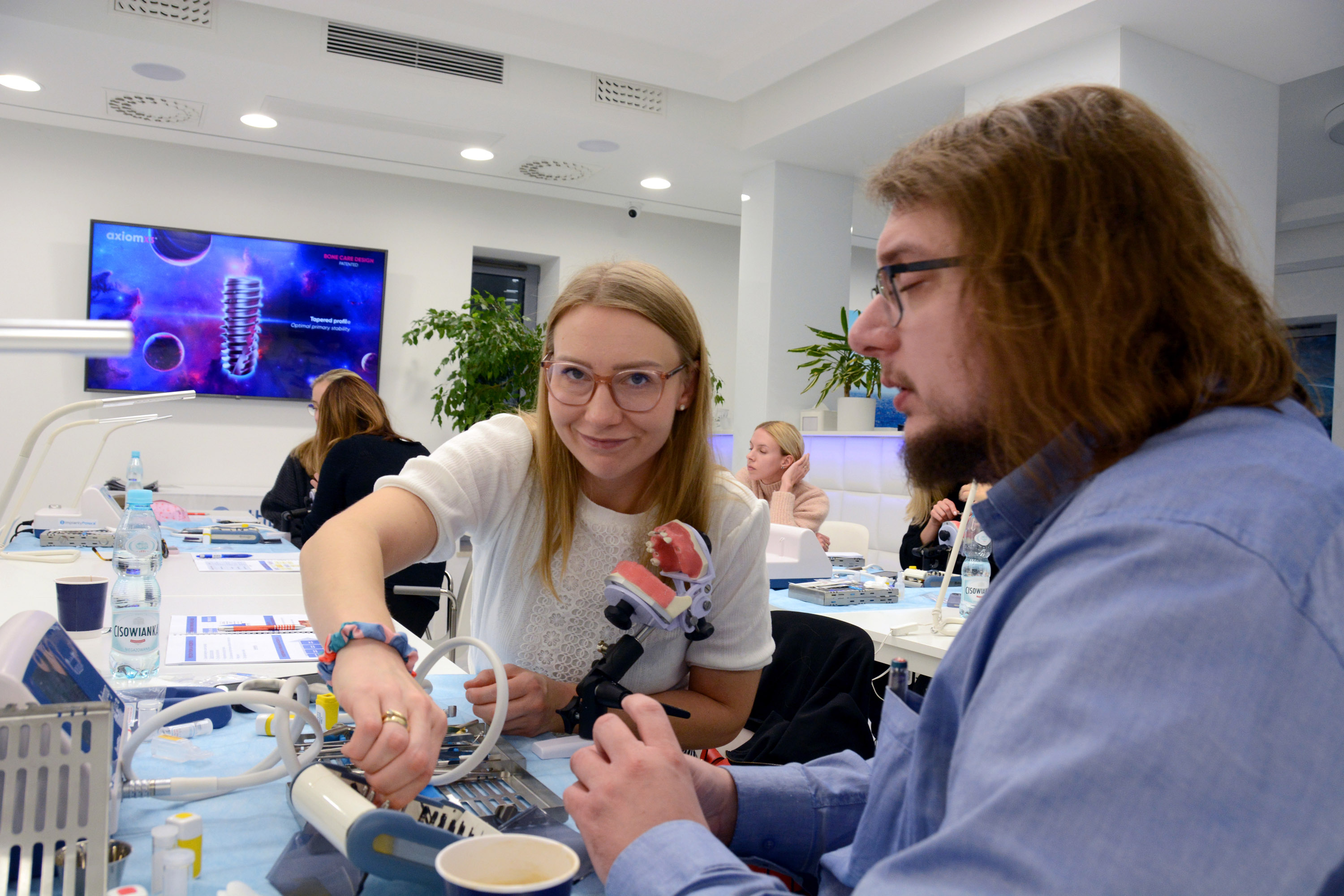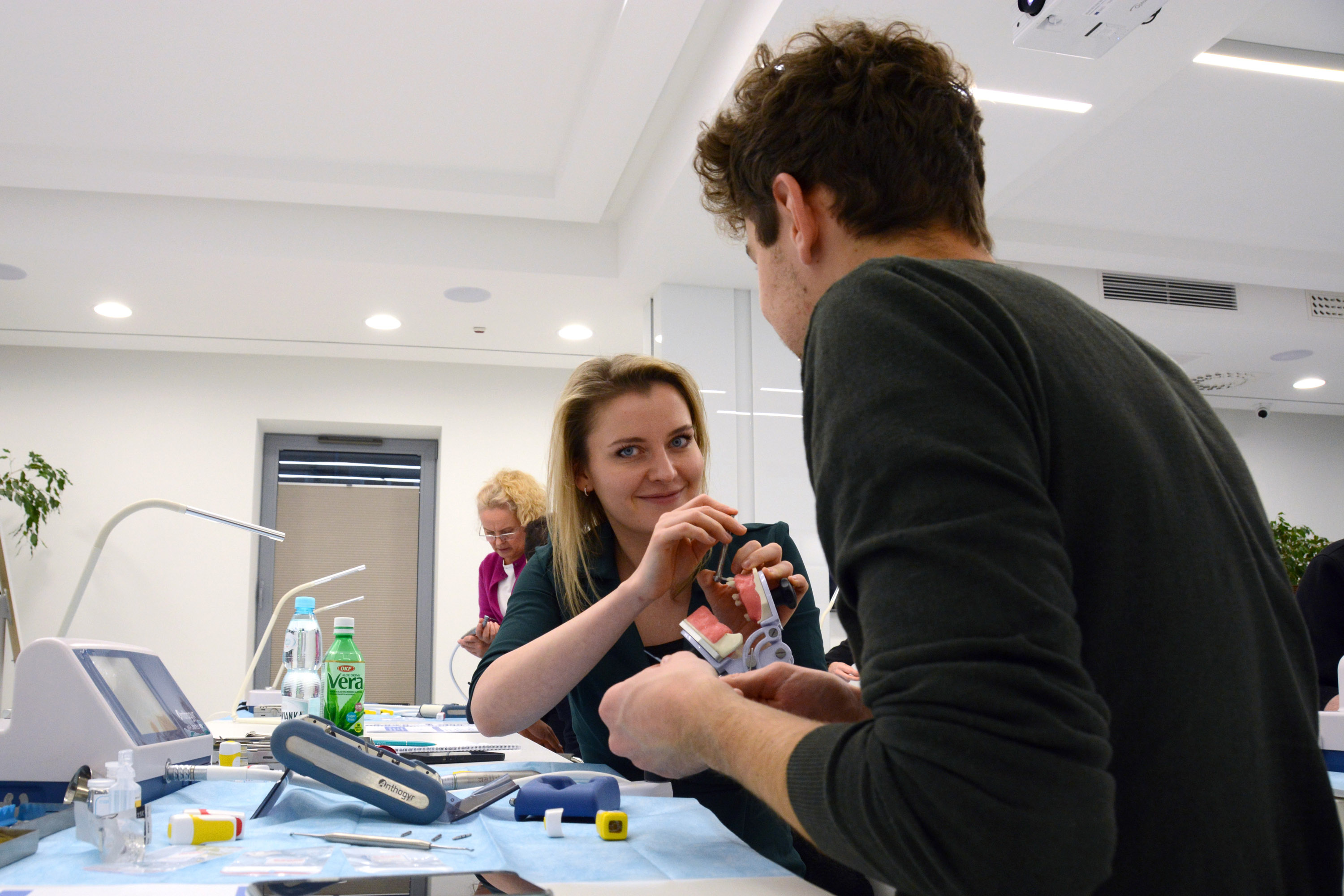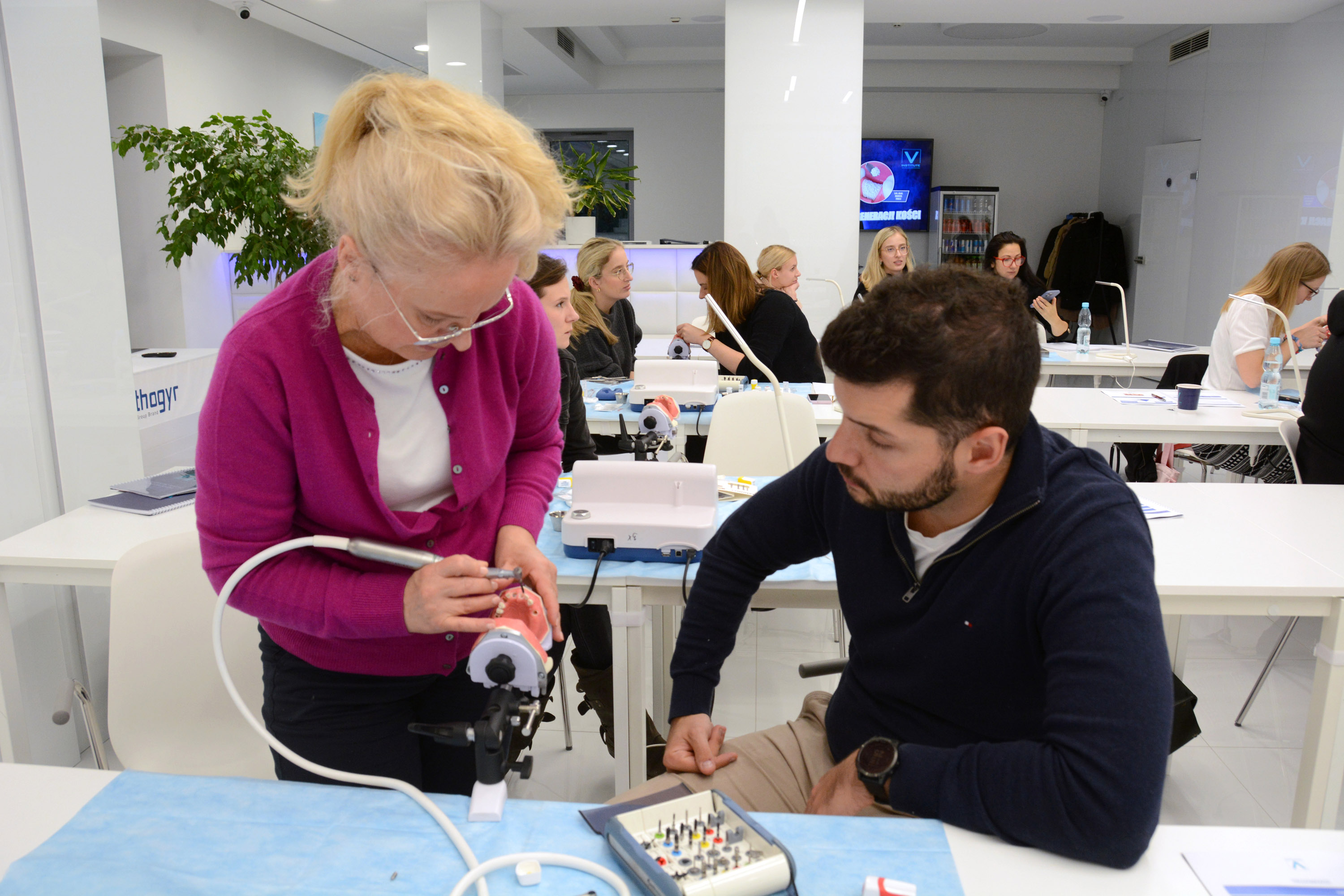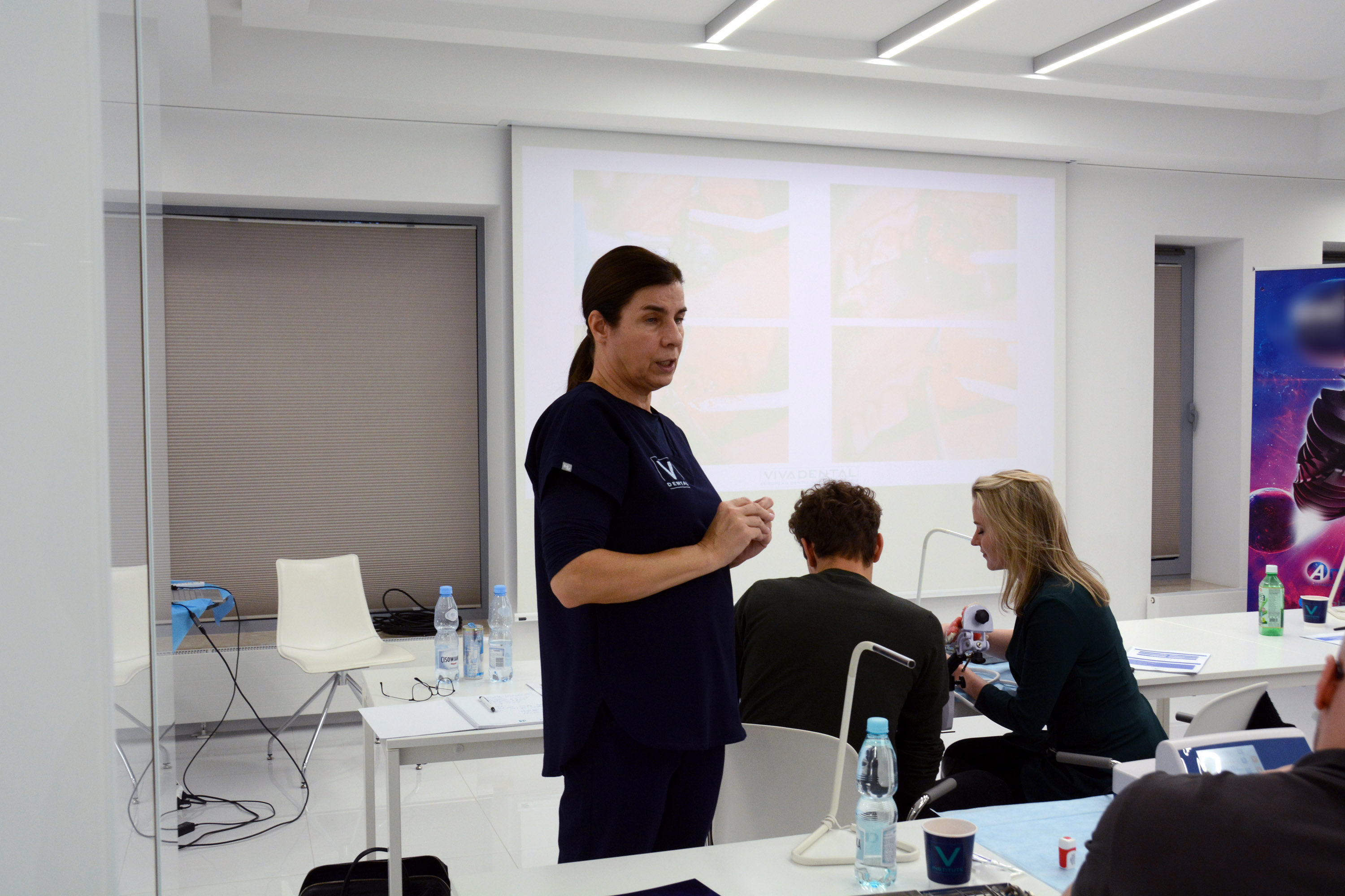 Dr n. med. Magdalena Kisłowska-Syryczyńska podzieliła się wiedzą odnośnie metody pozyskiwania, wirowania i zastosowanie PRF / fibryny bogatopłytkowej. Kolejno odbył się zabieg regeneracji kości wykonany przez kursantów. Odbudowany został wyrostek zębodołowy szczęki z zastosowaniem kości własnej, preparatu kościozastępczego i błony zaporowej.