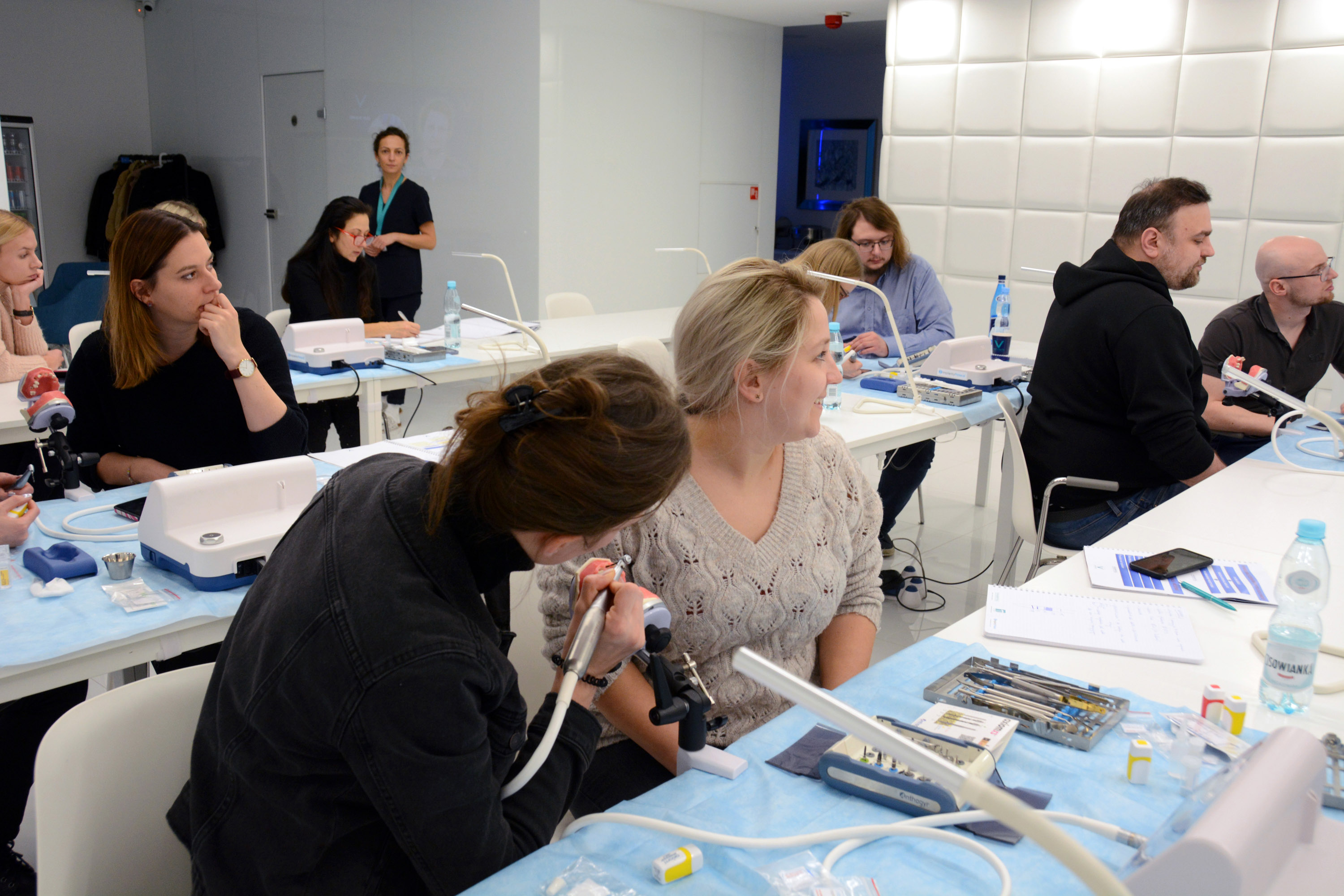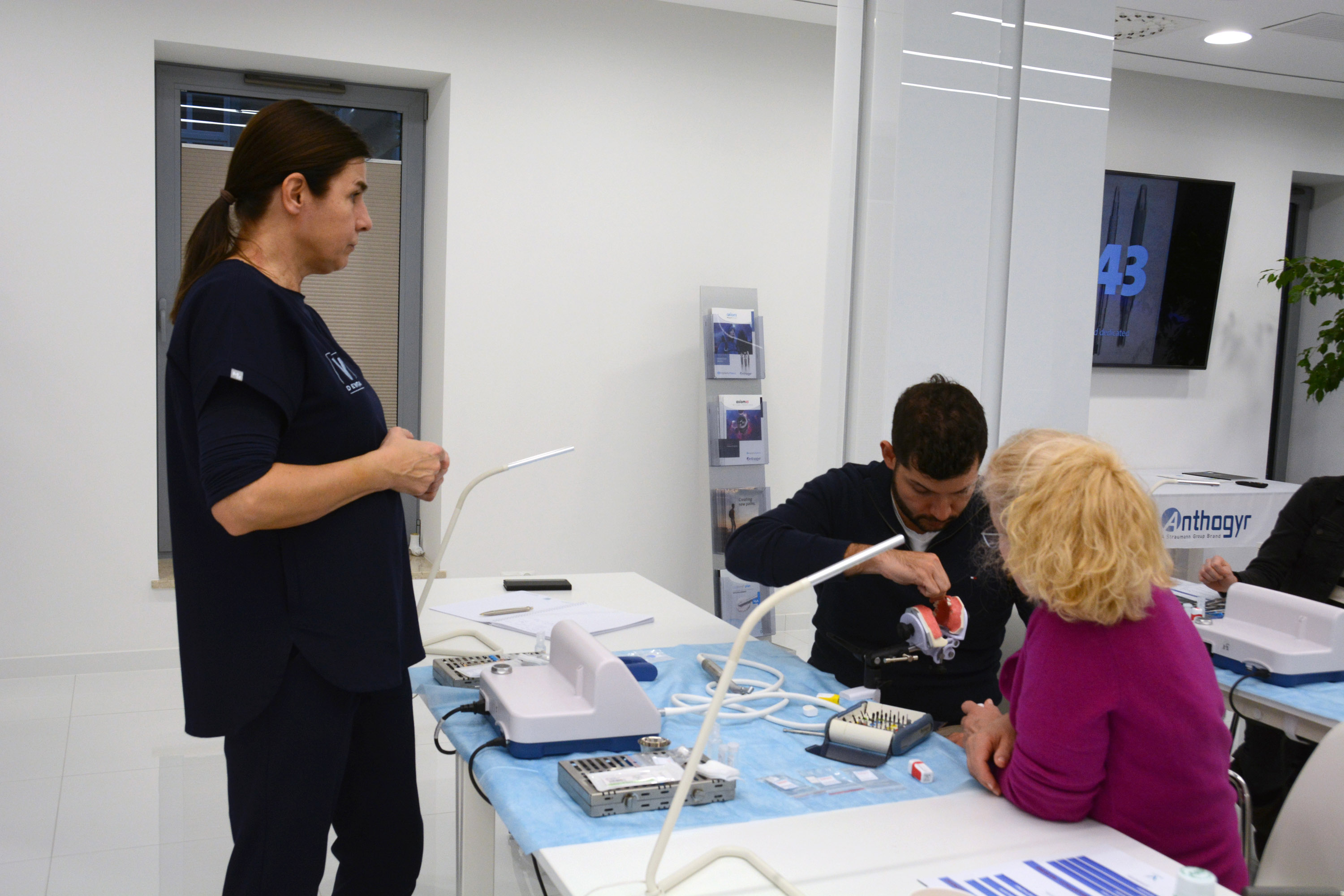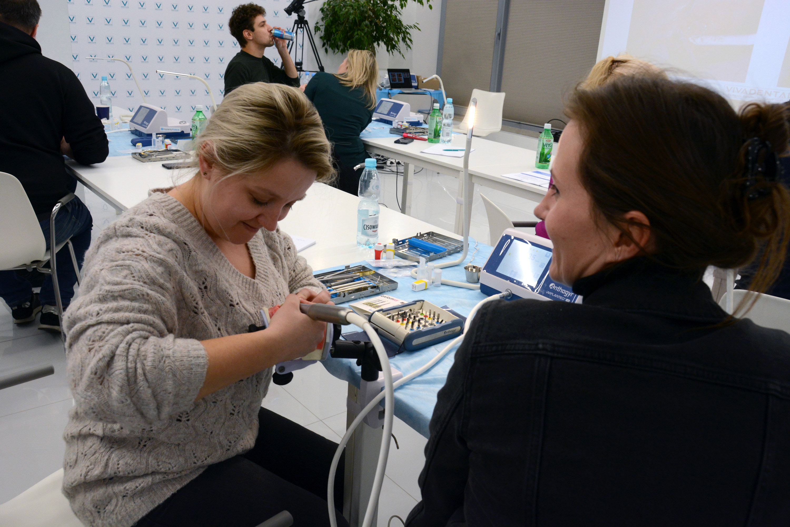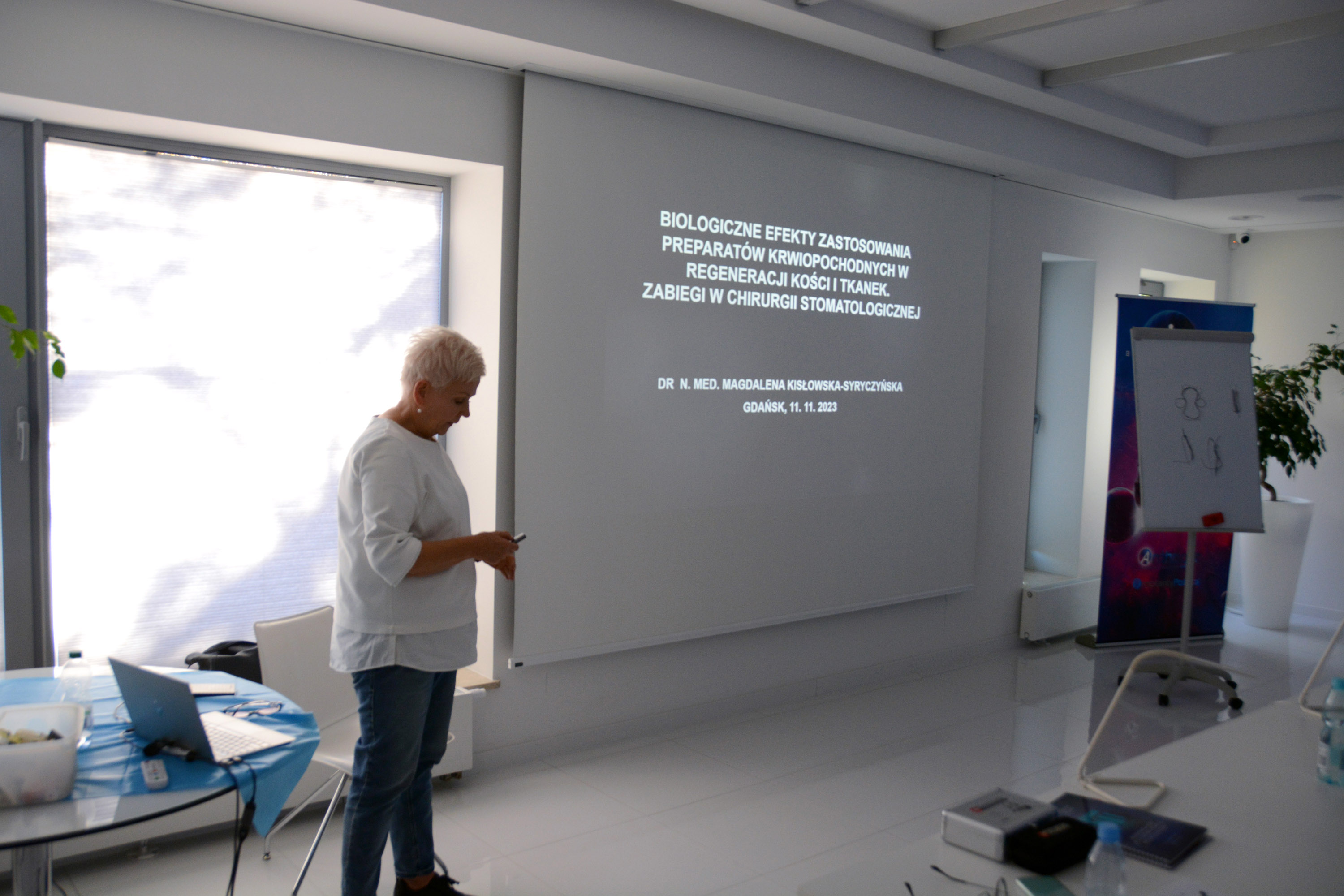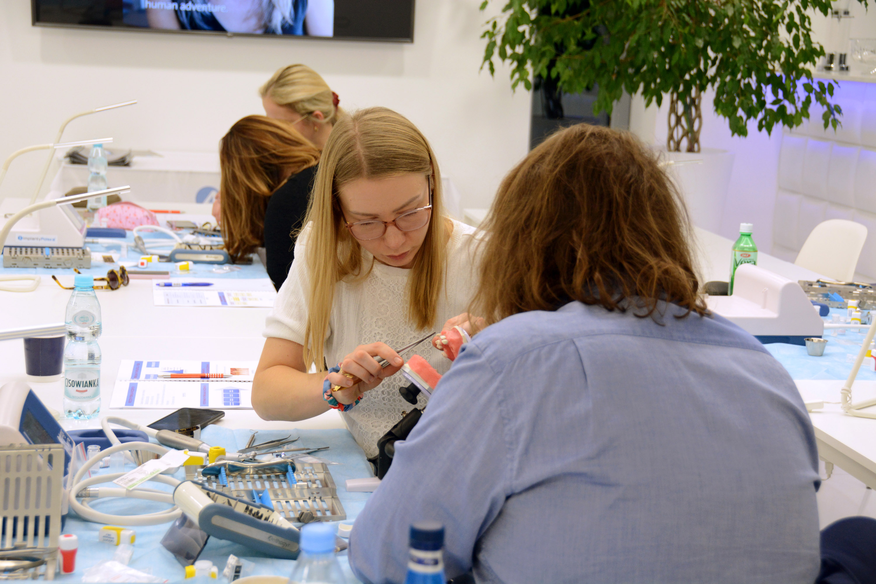 Dr n. med. Magdalena Kisłowska-Syryczyńska podzieliła się wiedzą odnośnie metody pozyskiwania, wirowania i zastosowanie PRF / fibryny bogatopłytkowej. Kolejno odbył się zabieg regeneracji kości wykonany przez kursantów. Odbudowany został wyrostek zębodołowy szczęki z zastosowaniem kości własnej, preparatu kościozastępczego i błony zaporowej.