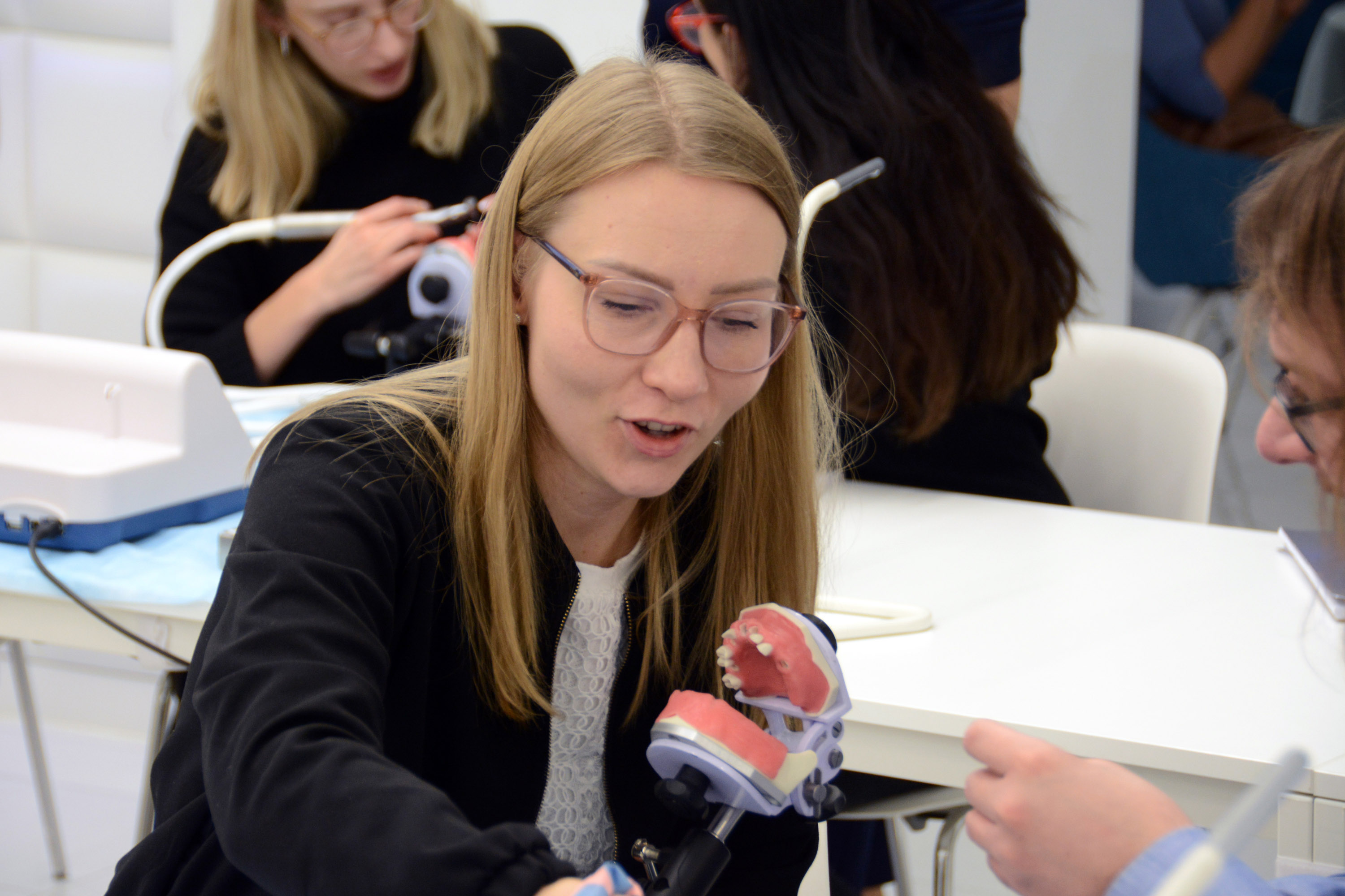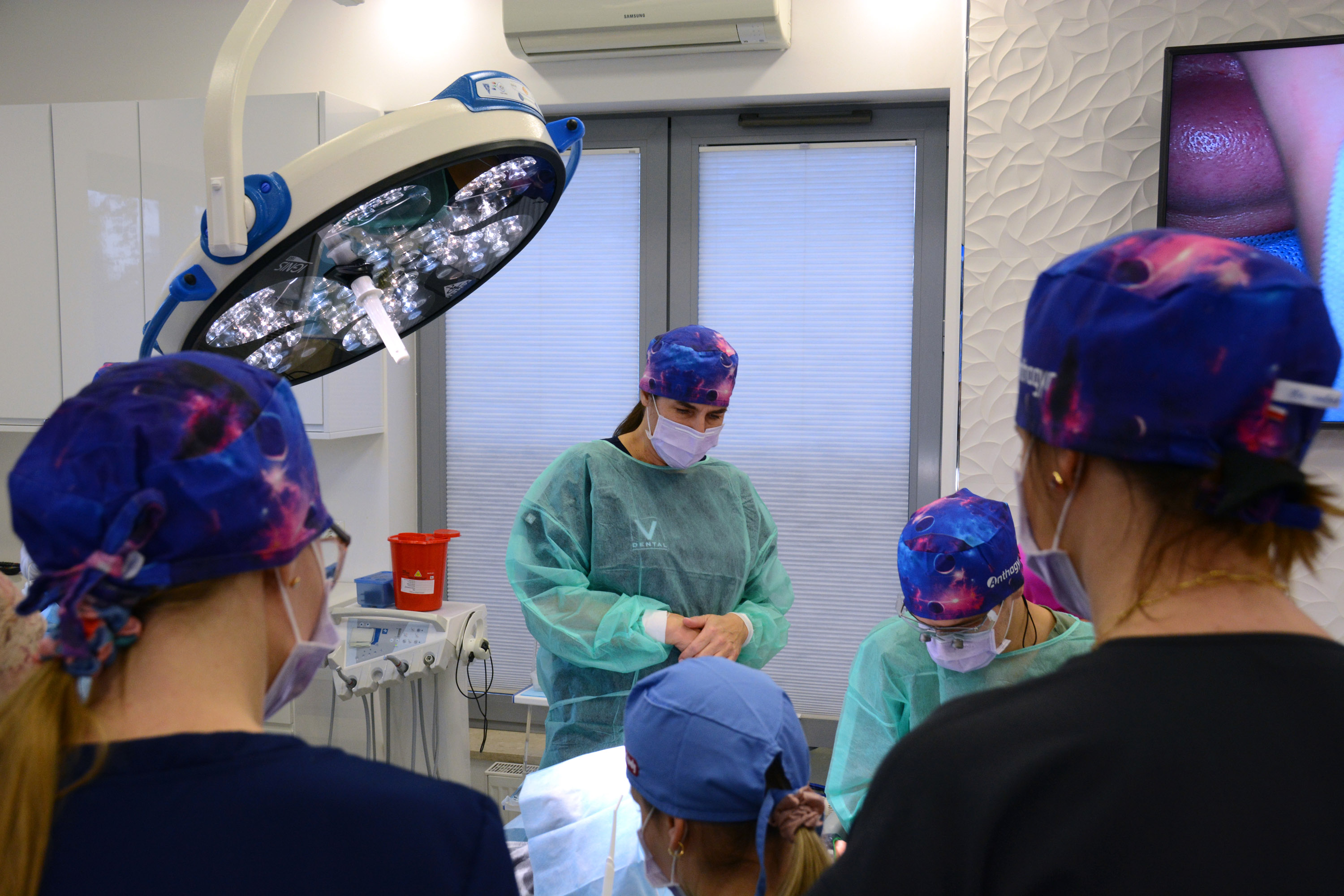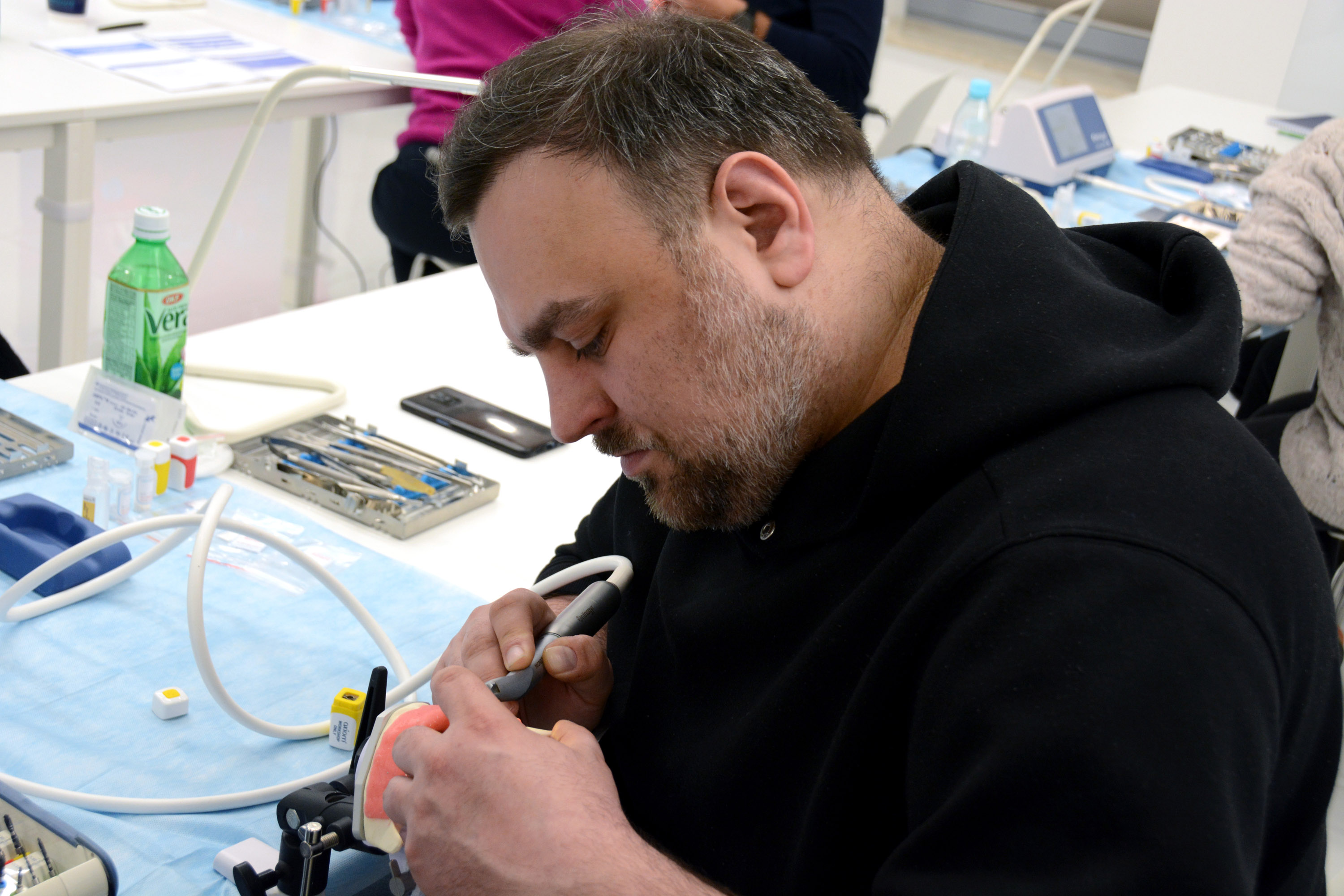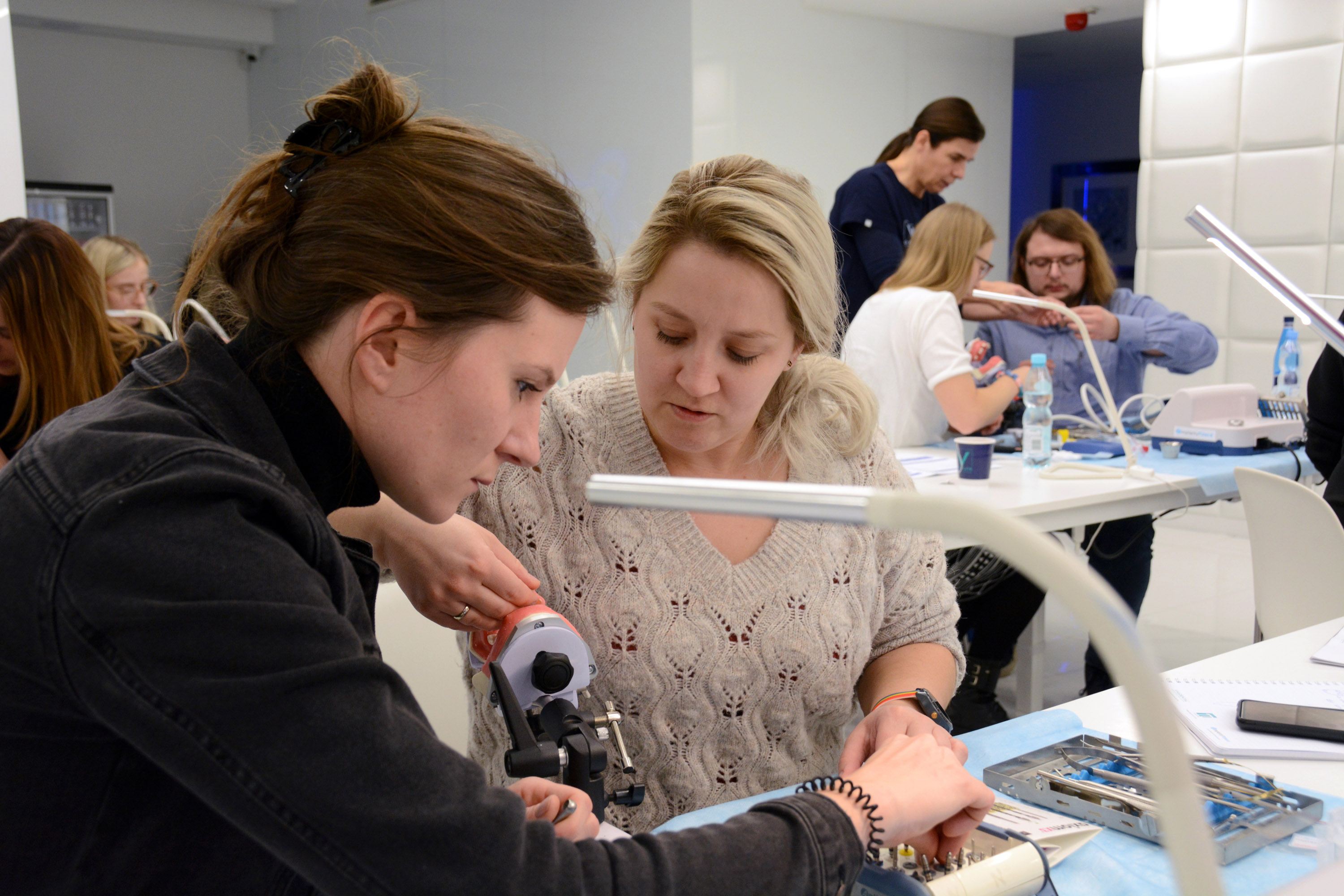 Dr n. med. Magdalena Kisłowska-Syryczyńska podzieliła się wiedzą odnośnie metody pozyskiwania, wirowania i zastosowanie PRF / fibryny bogatopłytkowej. Kolejno odbył się zabieg regeneracji kości wykonany przez kursantów. Odbudowany został wyrostek zębodołowy szczęki z zastosowaniem kości własnej, preparatu kościozastępczego i błony zaporowej.