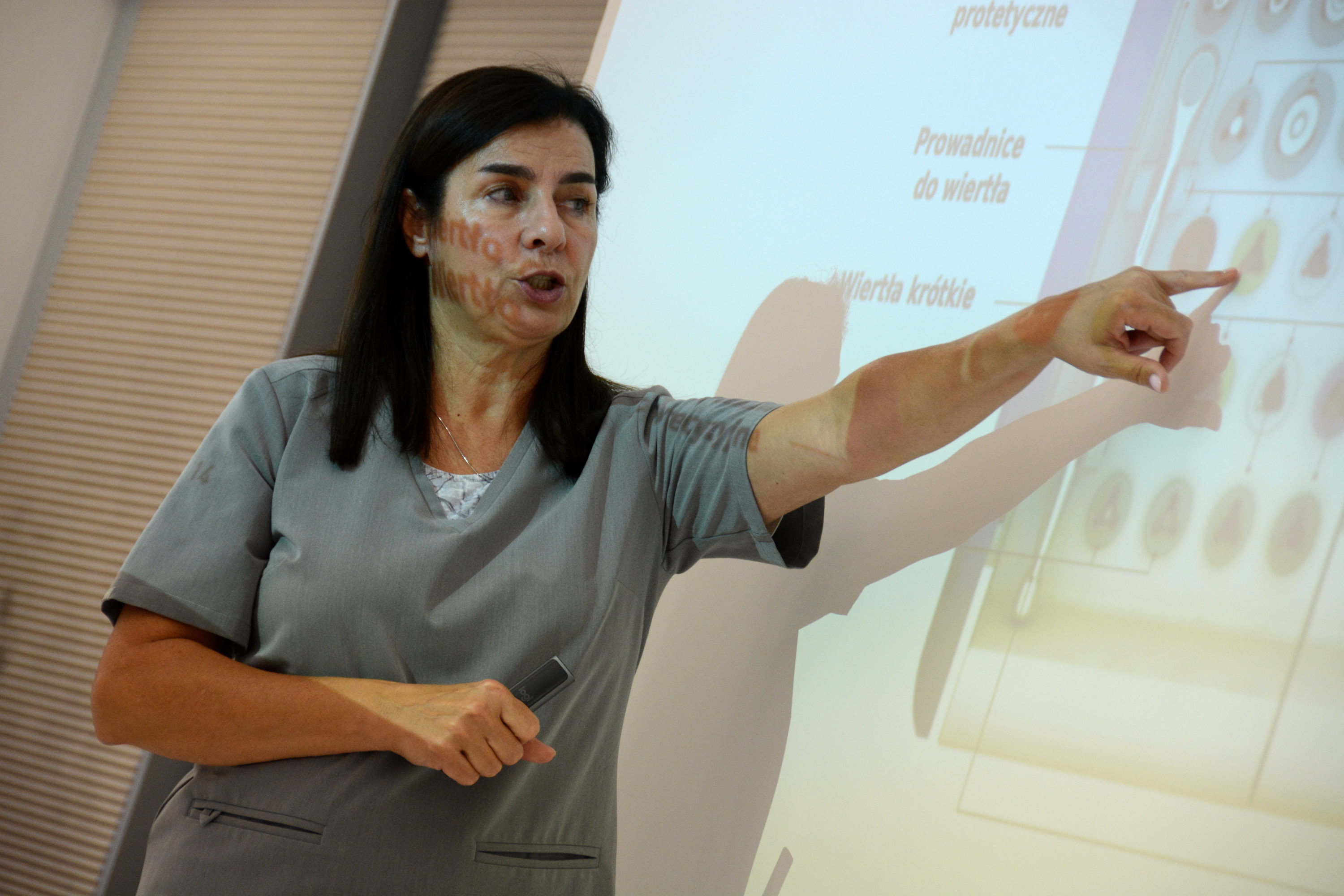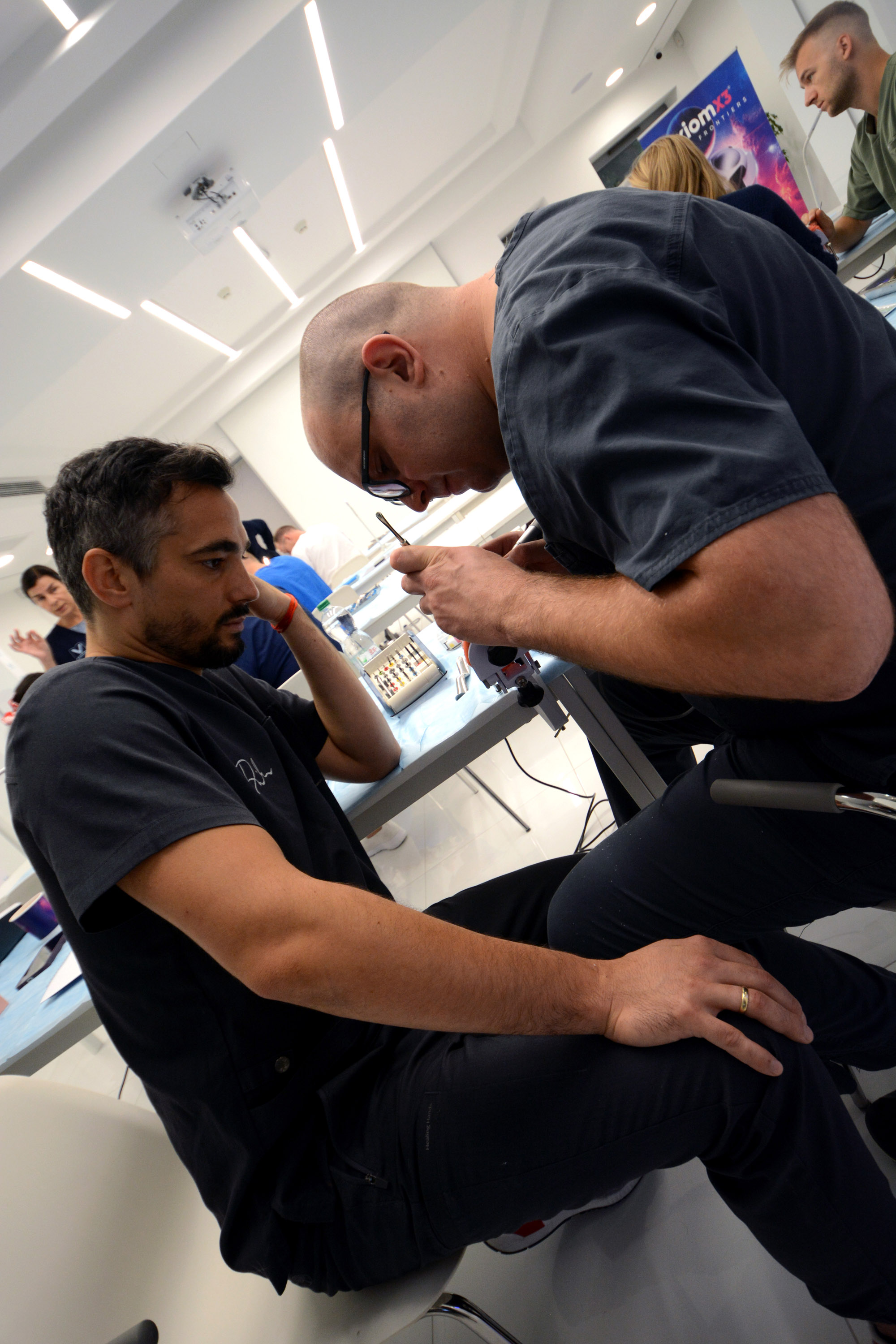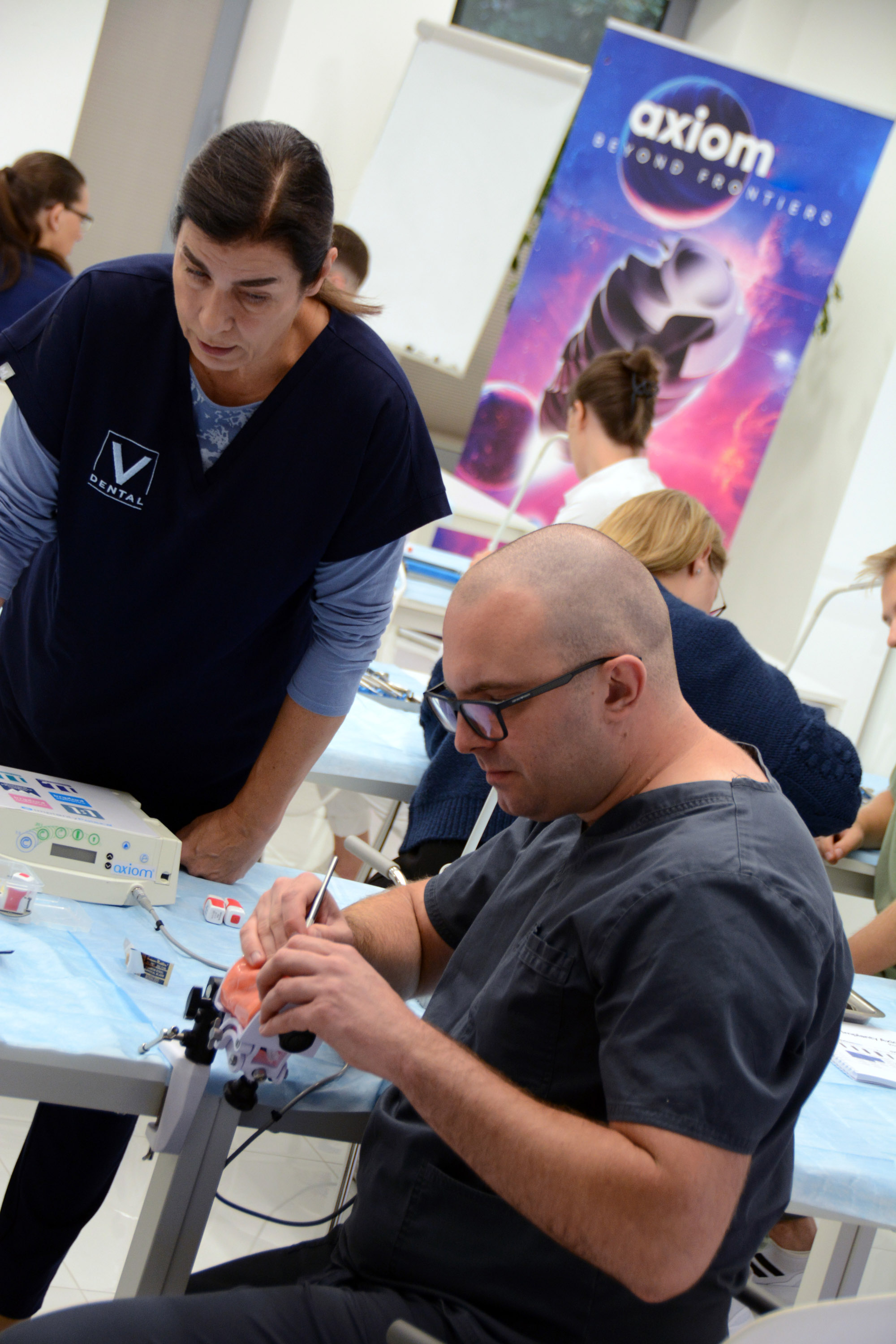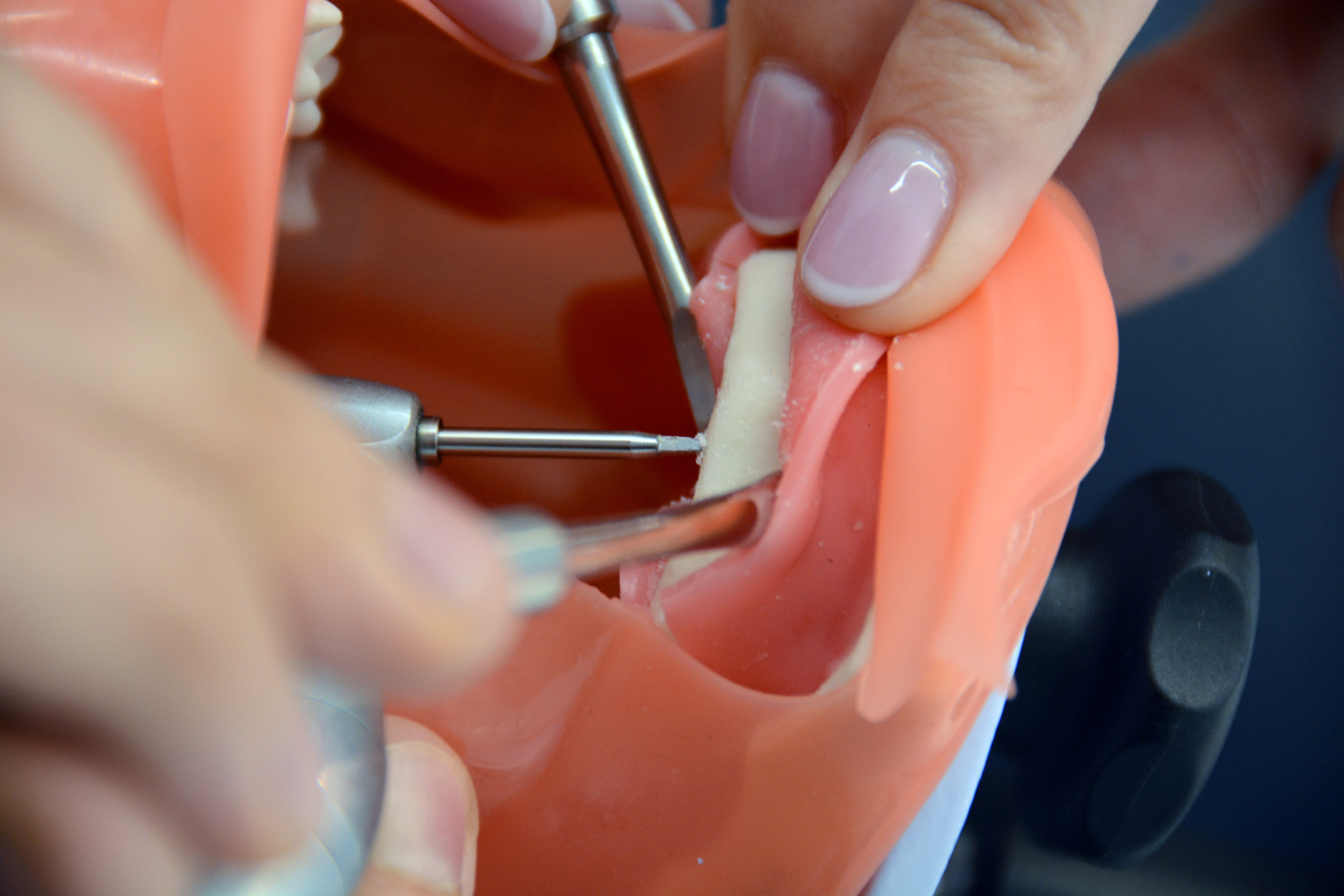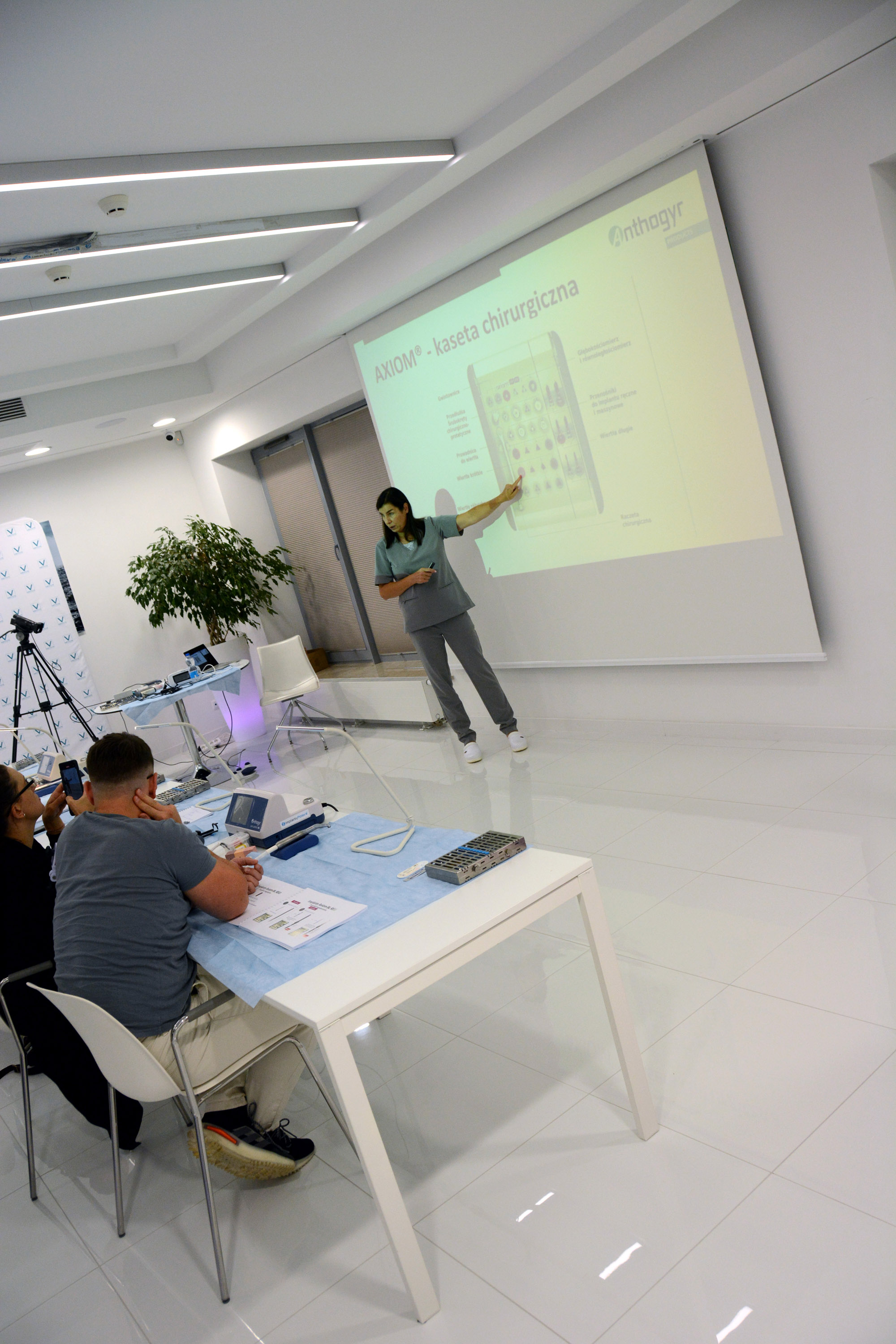 Już na pierwszym etapie szkolenia uczestnicy zapoznali się z systemem implantologicznym Axiom, a następnie ćwiczyli na modelach, przygotowując się do pracy z pacjentem. Zwieńczeniem pierwszej sesji były zabiegi wprowadzenia łącznie trzech implantów w szczęce, odbudowa kości oraz odsłonięcie implantów- oczywiście wszystko odbyło się pod okiem dr n. med. Violetty Szycik.