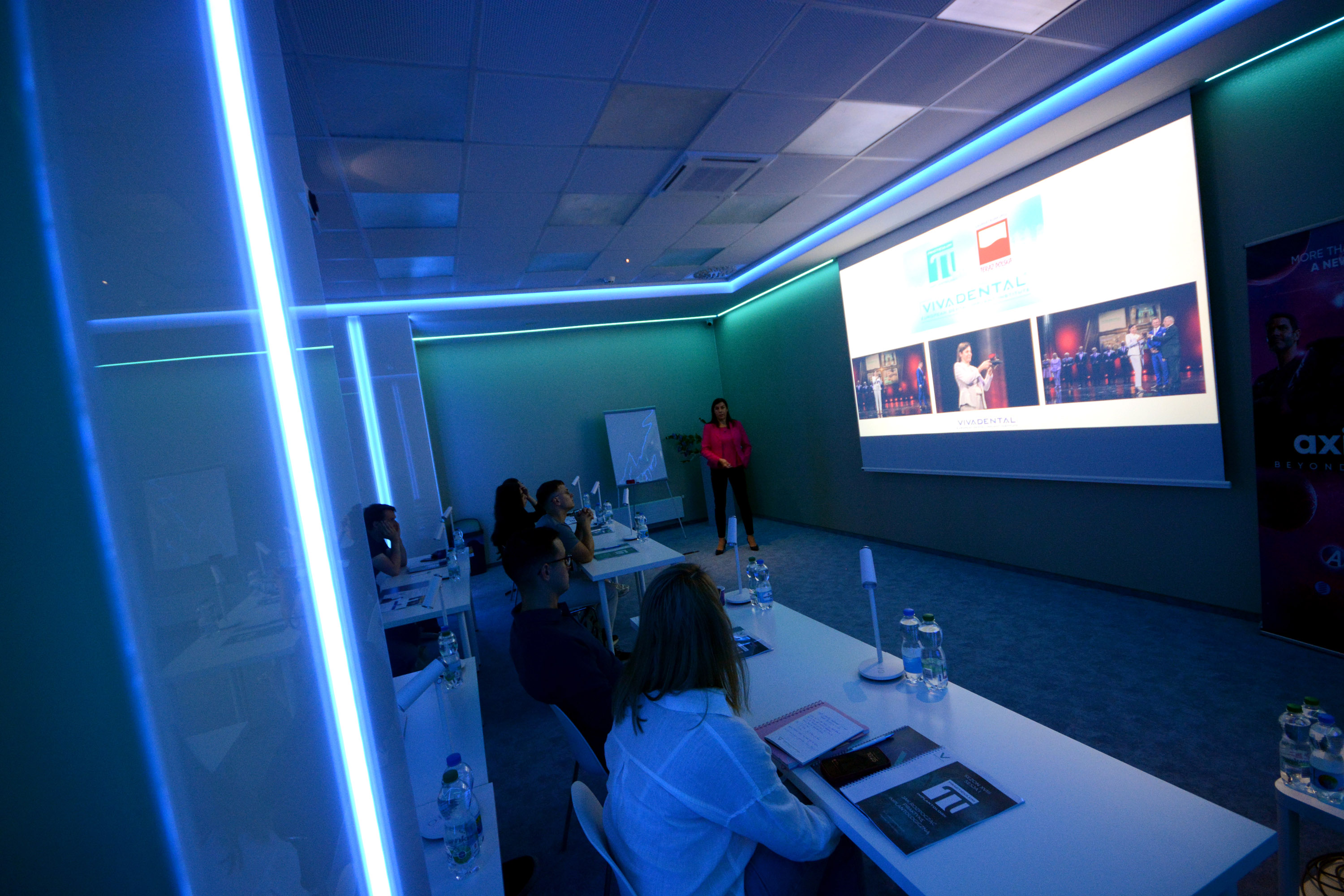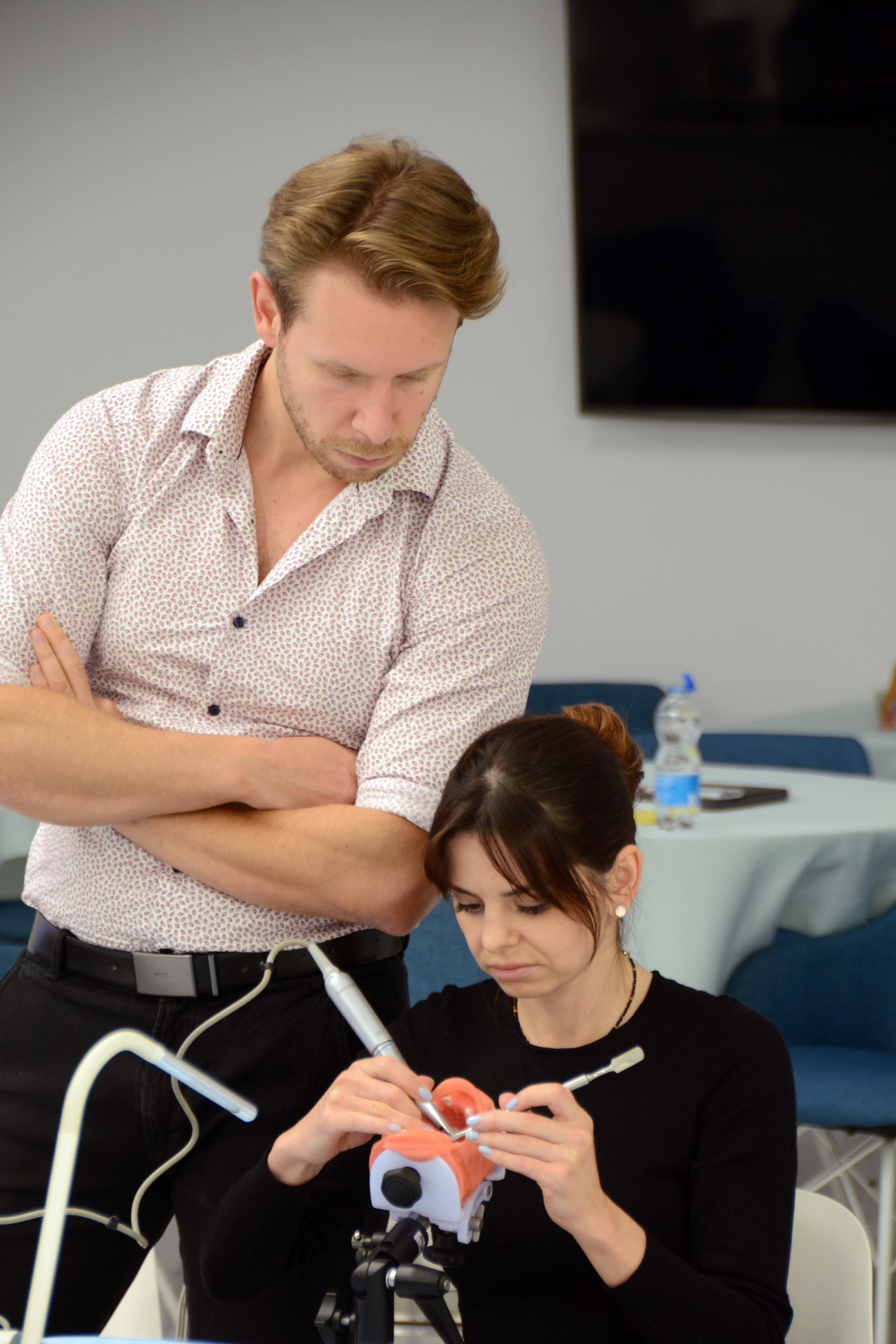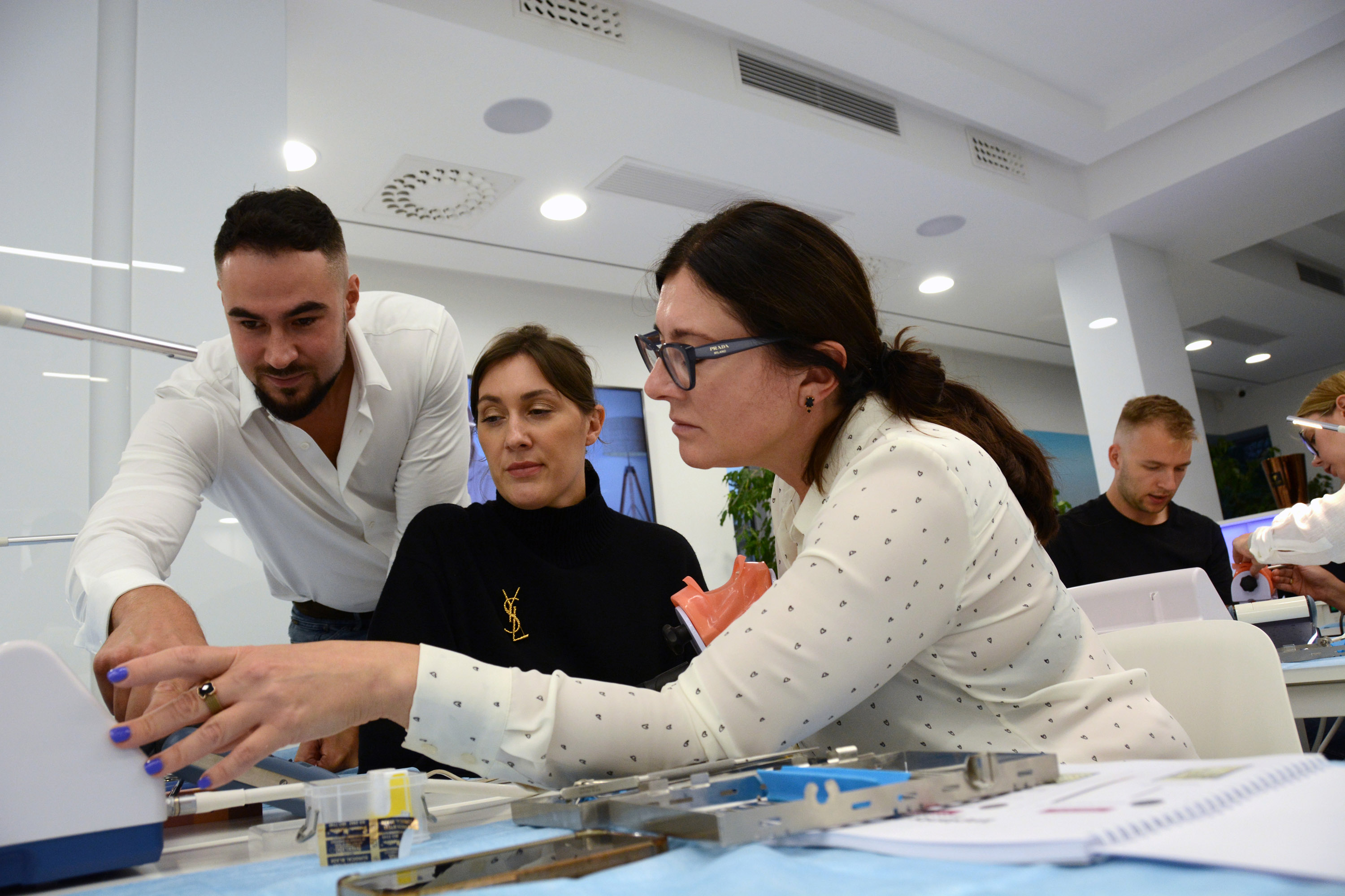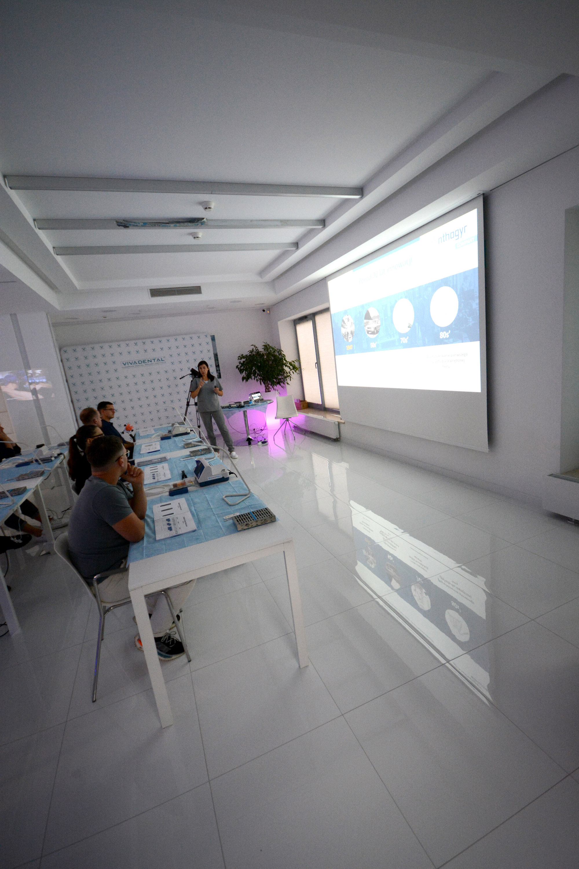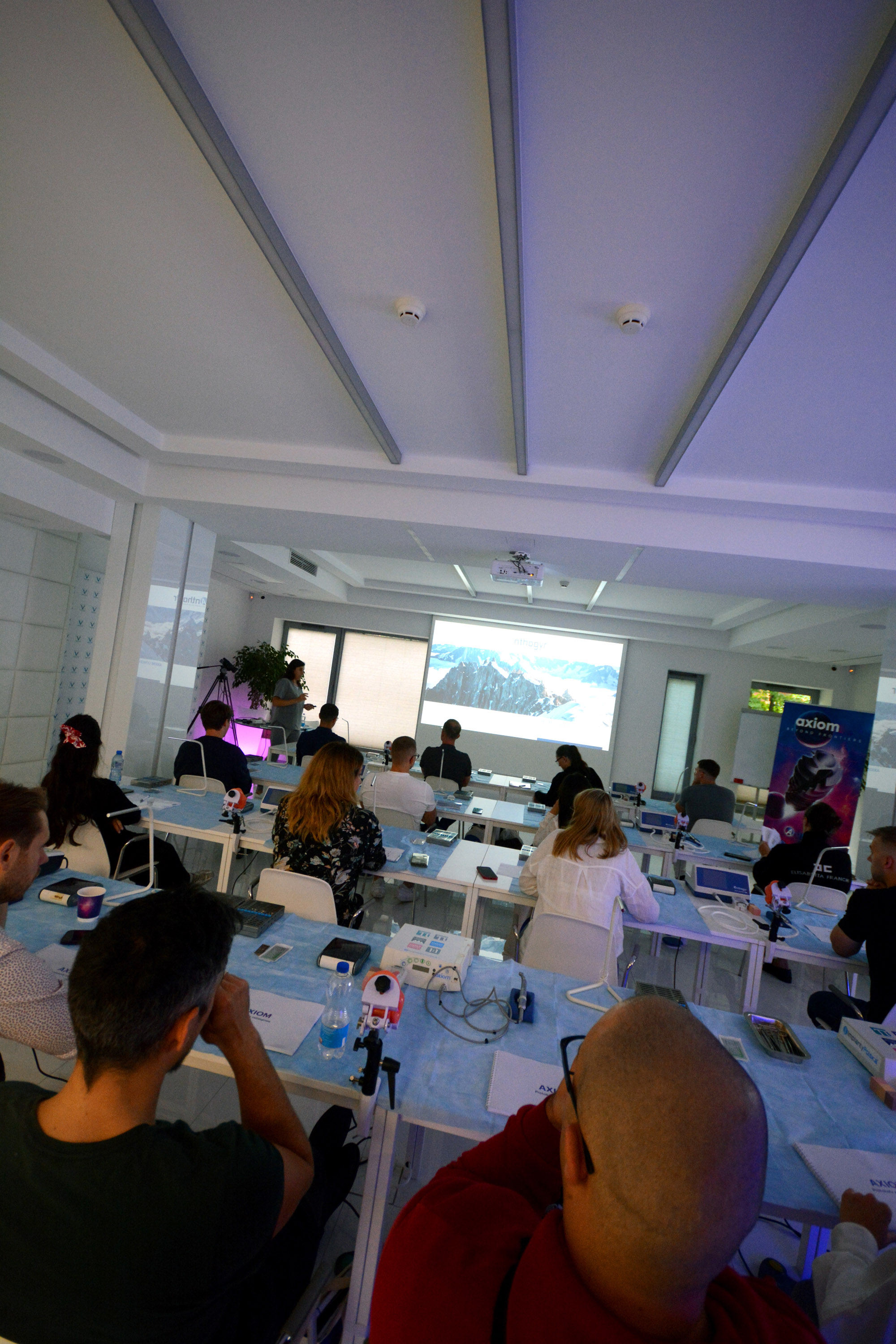 Już na pierwszym etapie szkolenia uczestnicy zapoznali się z systemem implantologicznym Axiom, a następnie ćwiczyli na modelach, przygotowując się do pracy z pacjentem. Zwieńczeniem pierwszej sesji były zabiegi wprowadzenia łącznie trzech implantów w szczęce, odbudowa kości oraz odsłonięcie implantów- oczywiście wszystko odbyło się pod okiem dr n. med. Violetty Szycik.